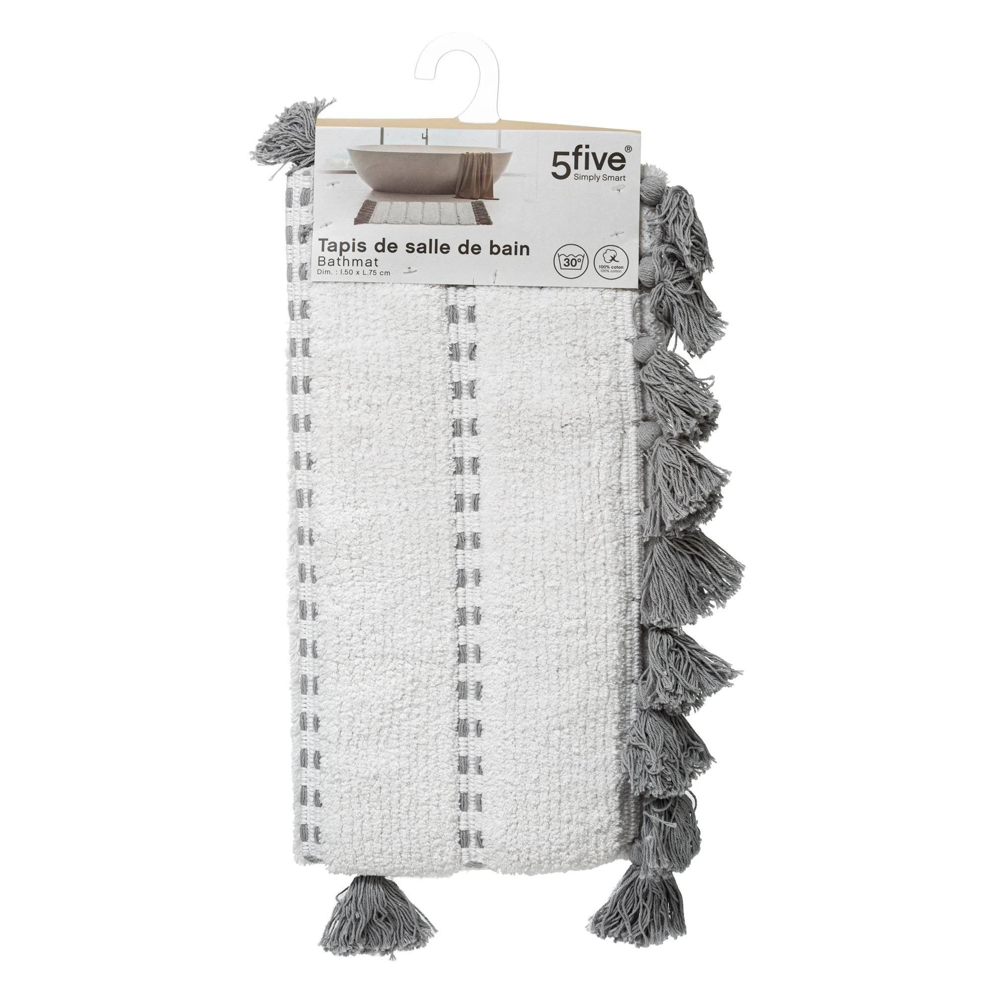Die Matte kann in der Waschmaschine bei einer maximalen Temperatur von 30 Grad gewaschen werden. Dadurch ist es möglich, Sauberkeit und Hygiene ohne großen Aufwand aufrechtzuerhalten. Der Badteppich hat dekorative Quasten an den Seiten. Getönte Farben in Grautönen passen zu den meisten Innenräumen. Der Teppich funktioniert besonders in einem Raum, der in einem modernen, minimalistischen Stil eingerichtet ist. Die Badezimmermatte mit Quasten ist ein Design der bekannten Marke 5five Simply Smart, das sich auf die Herstellung von modischen und praktischen Einrichtungsgegenständen und -dekorationen spezialisiert hat.