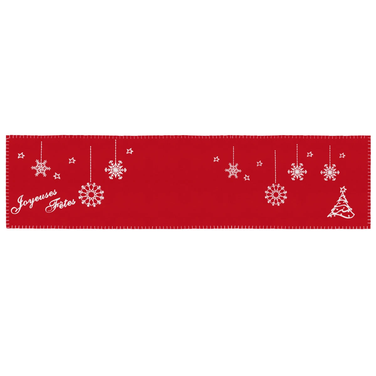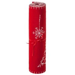 Weihnachtstisch-Dekoration: Intensive, rote Farbe in einzigartiger Weise mit Feiertagen verbunden. Zarte weiße Muster von Sternen und Weihnachtsbäumen betonen die festlich-winterliche Natur der Lauffläche. Perfekt für das Abendessen Heiligabend.