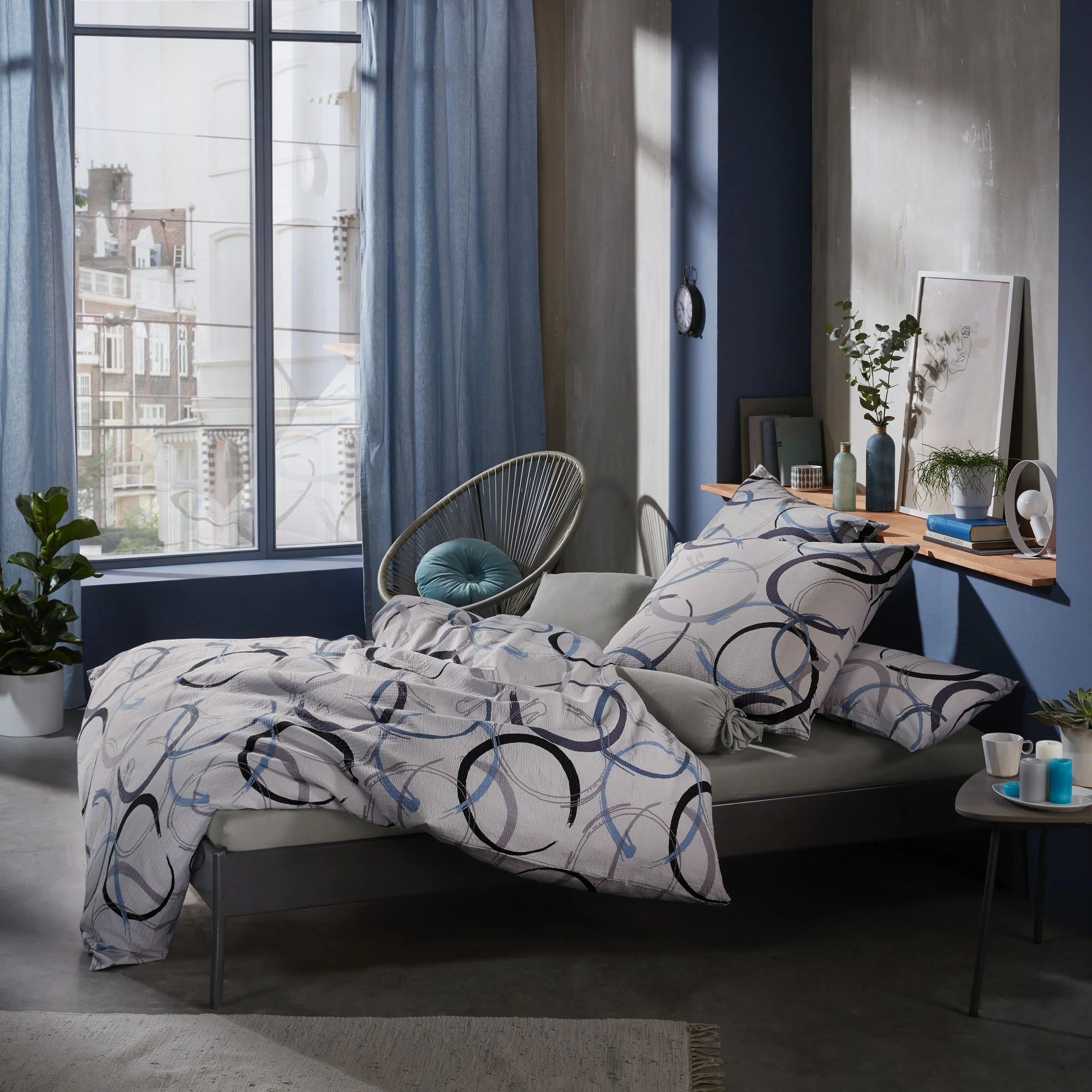 Erwin Müller Seersucker Bettwäsche. Modern und kreativ präsentieren sich die ineinandergreifenden Kreise in harmonischer Farbstellung. Sie verbreiten ein geschmackvolles Flair in Ihrem Schlafzimmer. Die besonders feinfädige Qualität mit der typischen gestreiften Krepp-Struktur ist ein luftig leichter Genuss. Sie ist weich im Griff, hautsympathisch und temperaturausgleichend. Schnell lassen Sie sich von ihren pflegeleichten Eigenschaften begeistern, denn die unkomplizierte Bettwäsche ist praktisch bügelfrei – einfach waschen, trocknen und dank Reißverschluss rasch wieder aufziehen.
