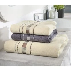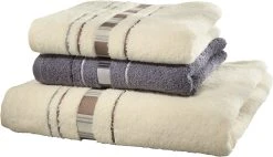 Erwin Müller 3-teiliges Walk-Frottier-Set “Achern”. Es sorgt für einen einheitlichen Look und eine behagliche Wohlfühlatmosphäre im Badezimmer. Die Webbordüre setzt farbharmonische, elegante Akzente. Genießen Sie die strapazierstarke Qualität mit ihrem voluminösen, flauschig weichen Flor, gut trocknend und hautfreundlich. Sie erhalten:2 Handtücher 50×100 cm1 Duschtuch 70×140 cm