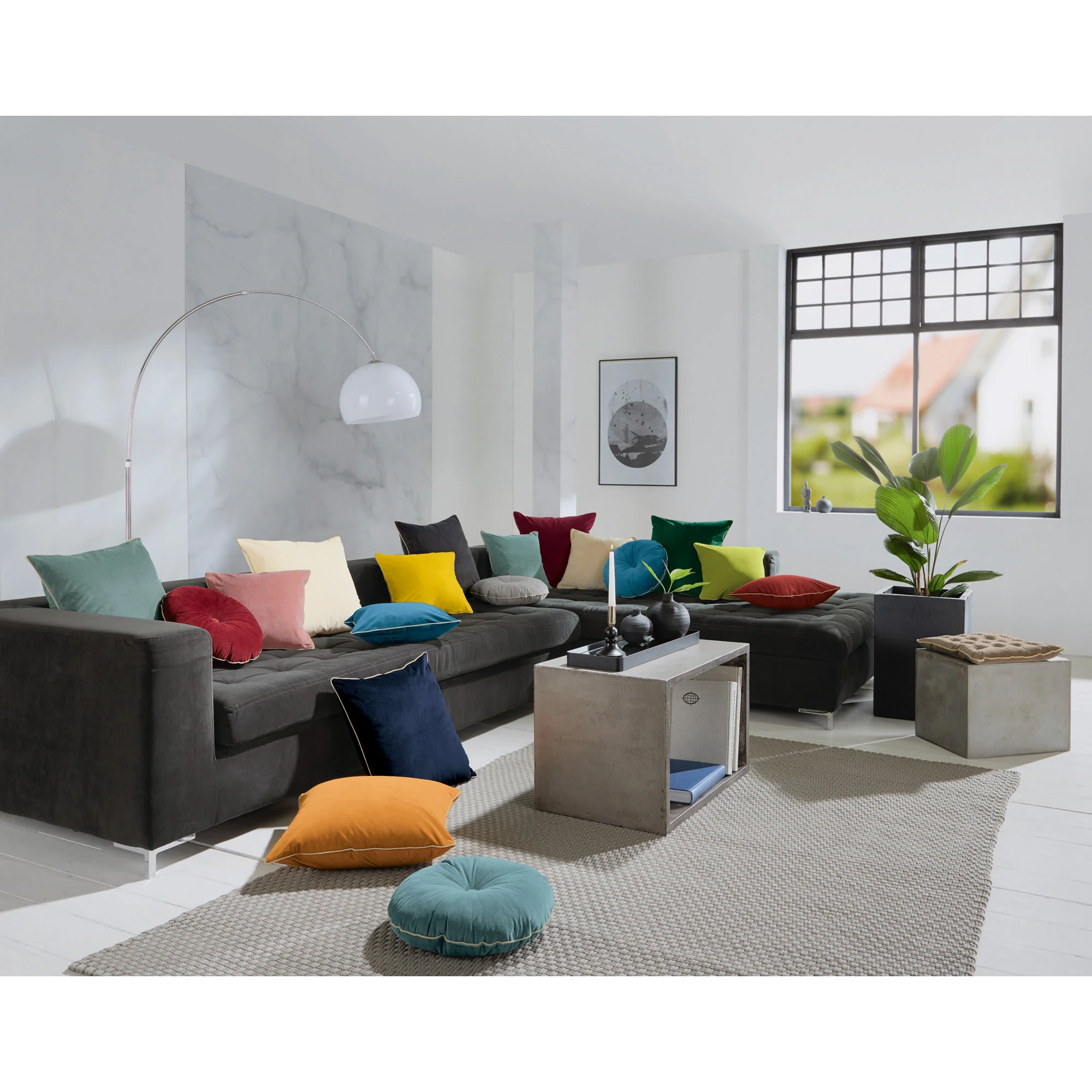 Erwin Müller Kissen “Manchester” rund, gefüllt. Setzen Sie mit dem hübschen Wohnaccessoire Farbtupfer auf Ihrem Sofa. Aufgewertet wird das runde Kissen von einer beidseitigen Steppung, die auf einer Seite mit einem Zierknopf versehen ist, und dem rundumlaufenden eleganten Keder. Aus samtig-weichem Velours, ein Material, das Sinnlichkeit und Eleganz versprüht.