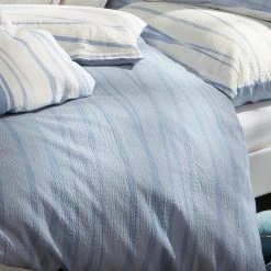 Erwin Müller Seersucker Kissenbezug in Wendeoptik. Das moderne Wellenmuster des stilvollen Kissenbezugs setzt sich auf der Rückseite konträr fort und sorgt so für einen belebenden Kontrast. In dem sommerlich leichten, duftig feinen Gewebe mit charakteristischer Krepp-Struktur werden Träume wahr. Die besonderen Eigenschaften dieser pflegeleichten Qualität, bügelfrei und mit Reißverschluss versehen, werden Sie schnell zu schätzen wissen: einfach waschen, trocknen und aufziehen.