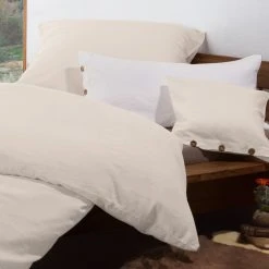 Erwin Müller Halbleinen Kuschelkissenbezug ”Deggendorf”. Puristische Raffinesse in zeitloser Schönheit. Der besondere Materialmix, ein robustes und dennoch anschmiegsames Baumwoll-Leinen-Gemisch, wirkt naturalistisch und ursprünglich. Seine typische Struktur und der edle Knittertouch sind charakteristisch, rustikale Holzknöpfe verleihen der Optik den letzen Schliff. Der weich vorgewaschene Stoff fühlt sich an warmen Tagen angenehm kühlend und wohltuend an. Er ist sehr atmungsaktiv, hautschmeichelnd und feuchtigkeitsregulierend. Die besten Voraussetzungen für ein erholsames, entspanntes Schlafvergnügen.