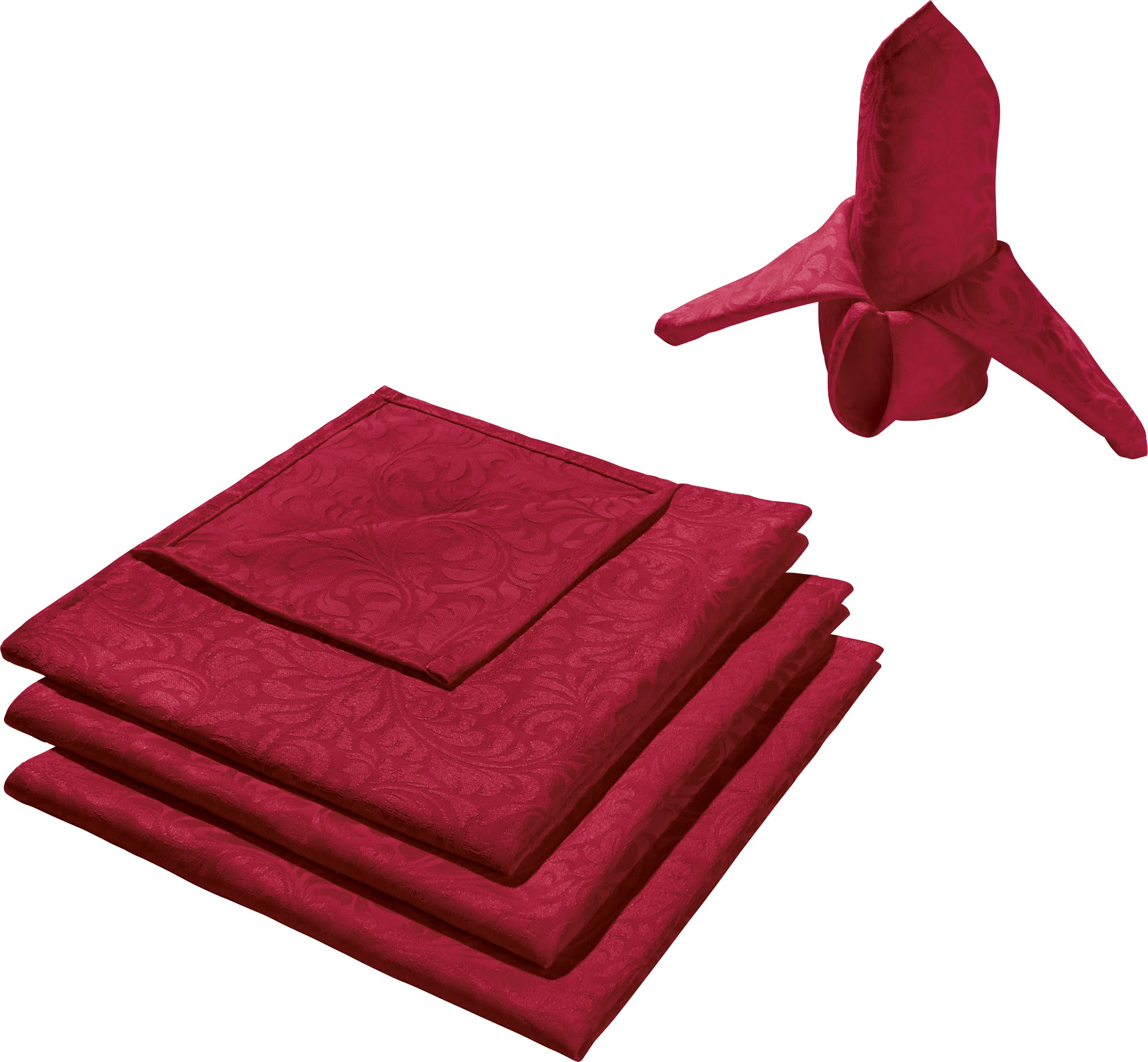 Erwin Müller Jacquard-Damast Serviette “Hamm” im 4er-Pack. Zu jedem Anlass schmückt die schöne Serviette mit eingewebten Ranken Ihren Tisch. Die Fleckschutzveredelung macht den Stoff schmutzunempfindlich und leicht zu reinigen. Bügeln nach der Wäsche auf der Rückseite frischt die Ausrüstung wieder auf.