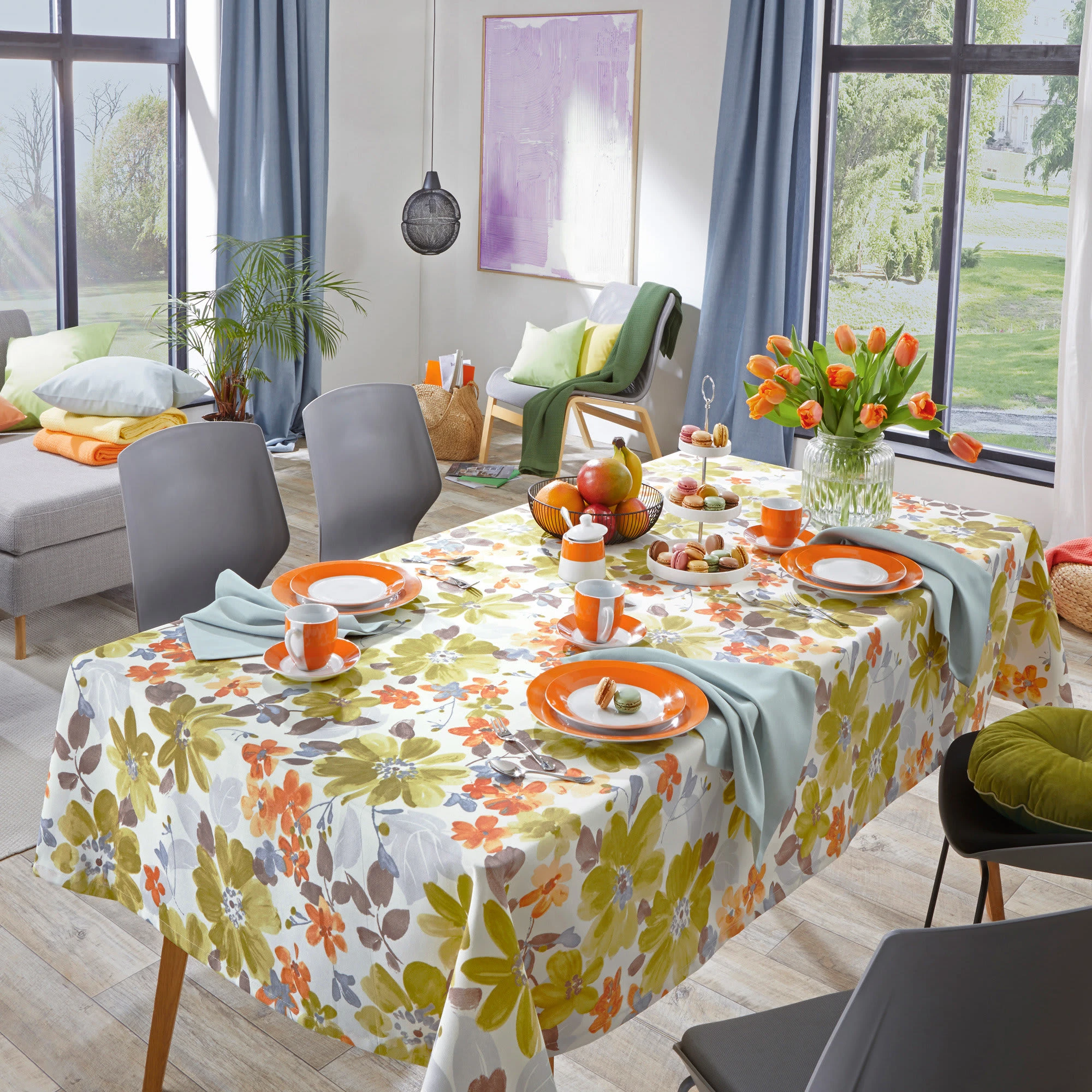 Erwin Müller Tischdecke. Wie gemalt wirken die fantasievollen Blumen. Sie kommen auf dem hellen Fond farbenprächtig zum Ausdruck. So verleihen Sie Ihrem Wohnambiente ein hinreißendes, fröhliches Aussehen. Die eckigen Decken sind mit Kuvertsaum gearbeitet. Robustes Gewebe, das durch seine Langlebigkeit und die hohe Strapazierfähigkeit überzeugt.