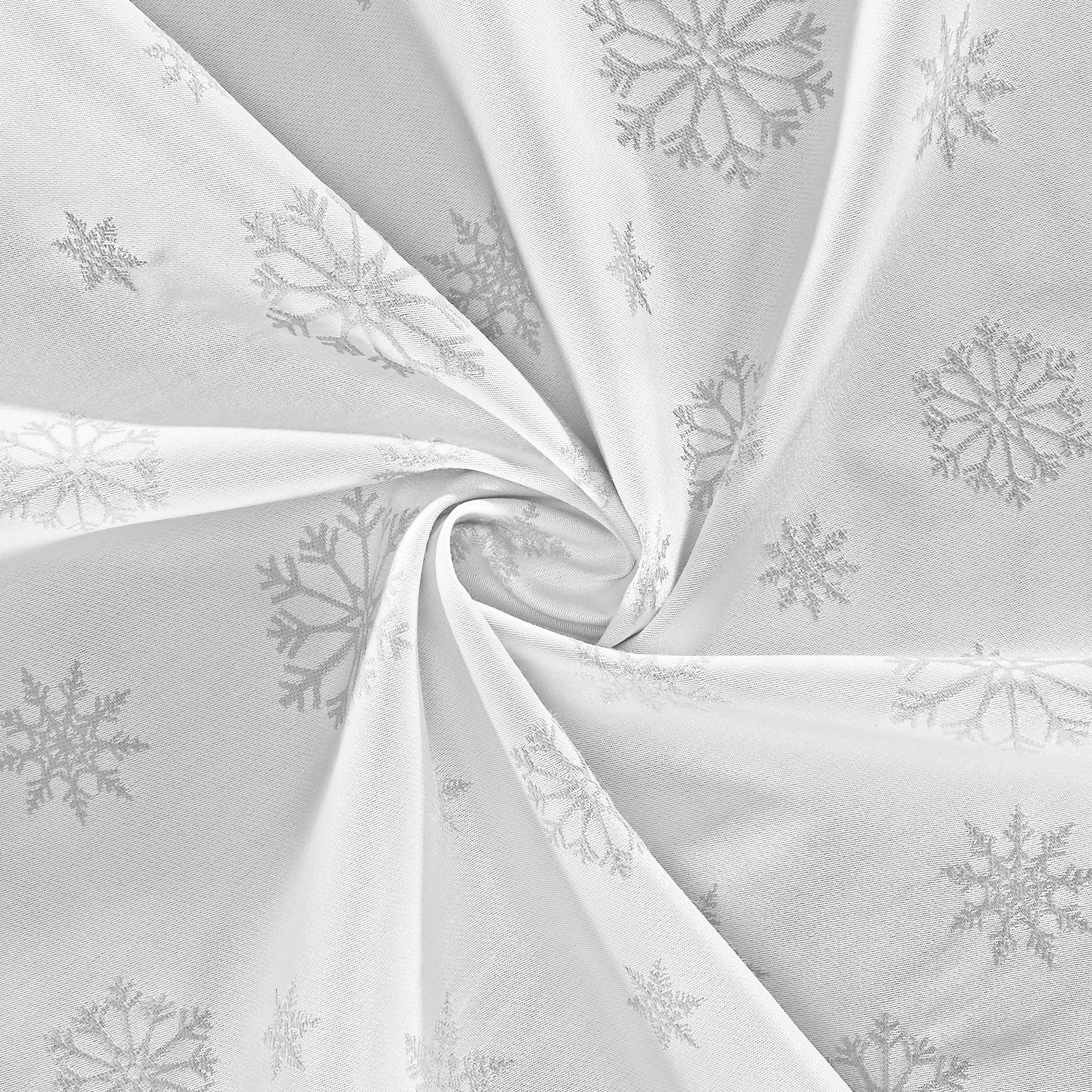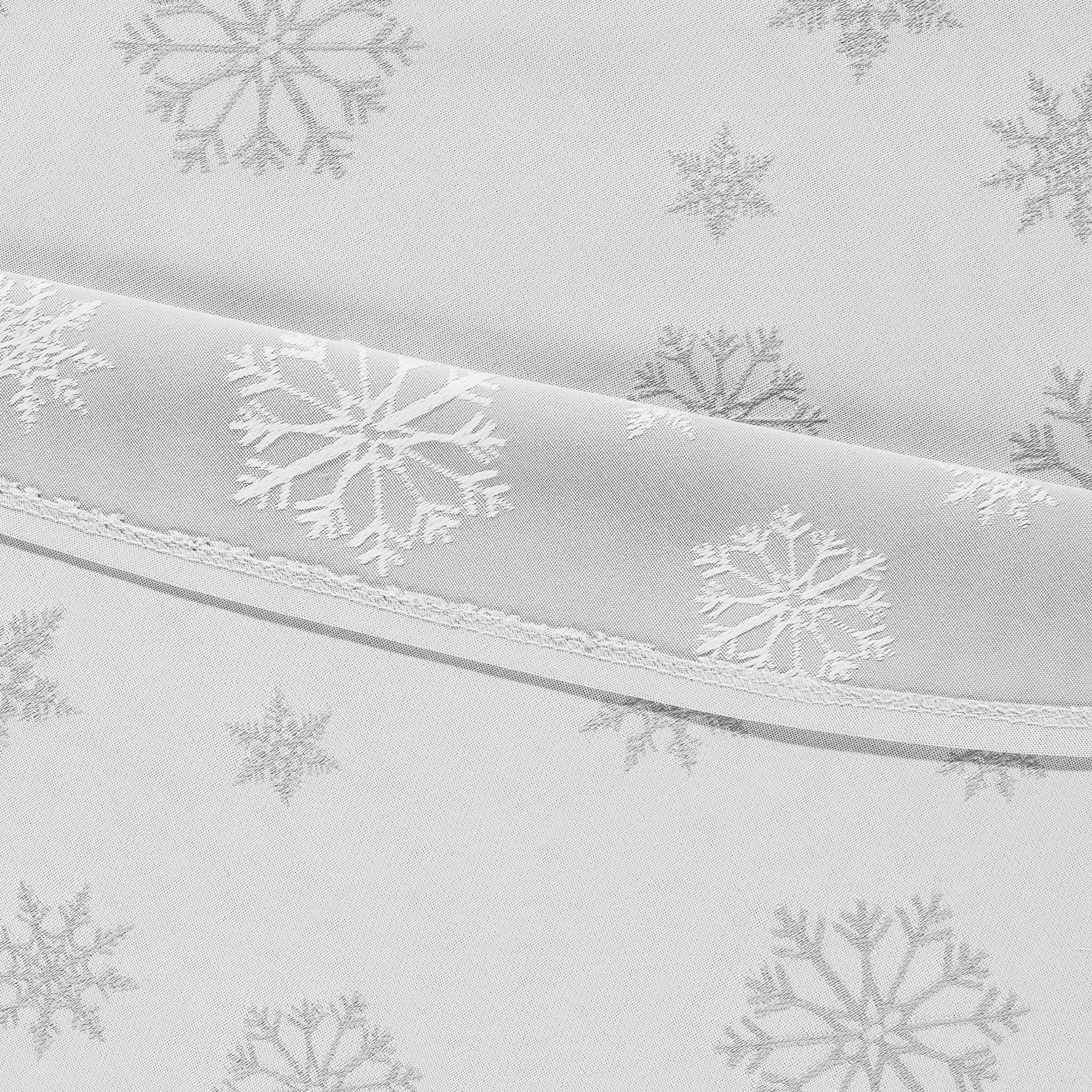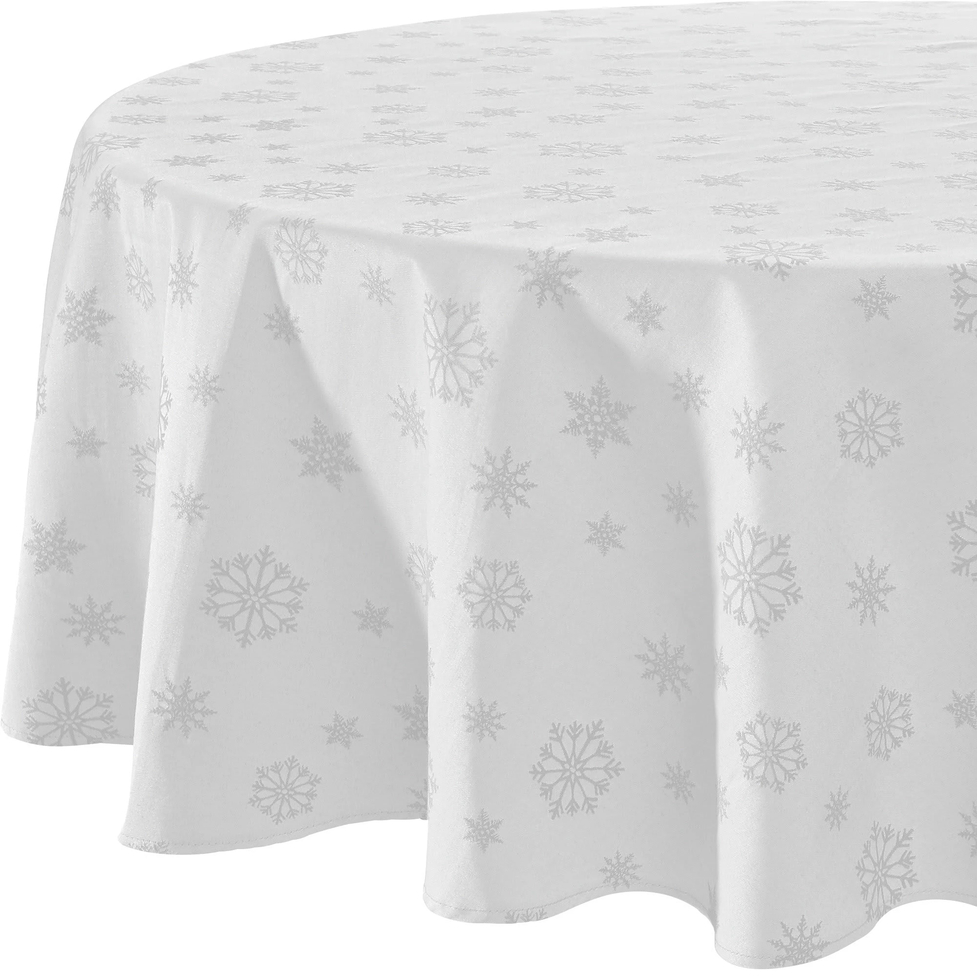 Erwin Müller fleckabweisende Jacquard-Damast Tischdecke “Marbella”. Aufwendige jacquardgewebte Schneekristalle verleihen der prächtigen Serie eine festliche Note. Die Fleckschutzveredelung macht den Stoff schmutzunempfindlich und leicht zu reinigen. Flüssigkeiten dringen nicht in das Gewebe ein, sondern perlen einfach ab und können mit einem Küchenkrepp aufgenommen werden. Das Bügeln nach der Wäsche auf der Rückseite frischt die Ausrüstung wieder auf. Die eckigen Tischdecken sind mit hochwertigem Kuvertsaum gearbeitet.