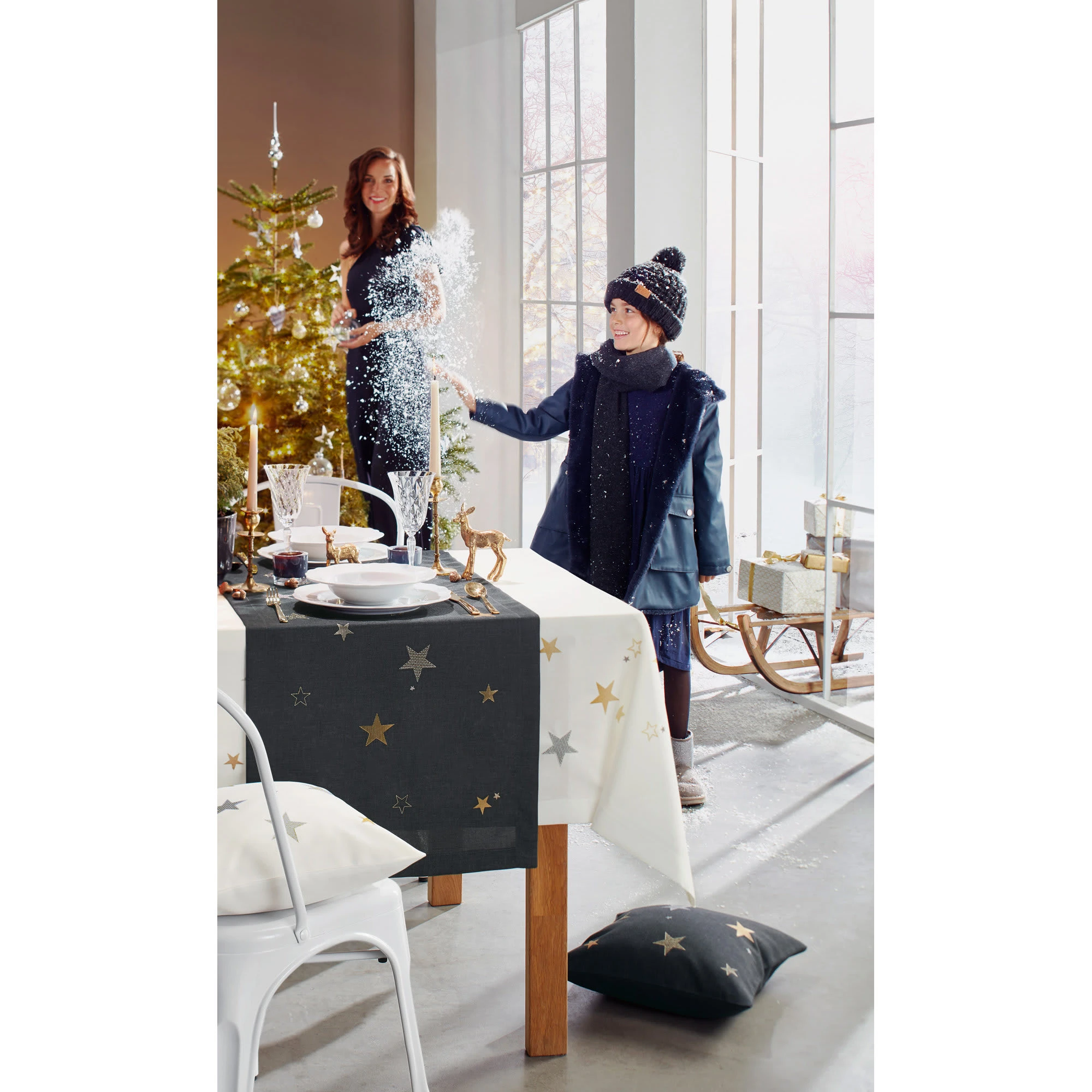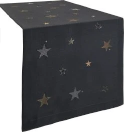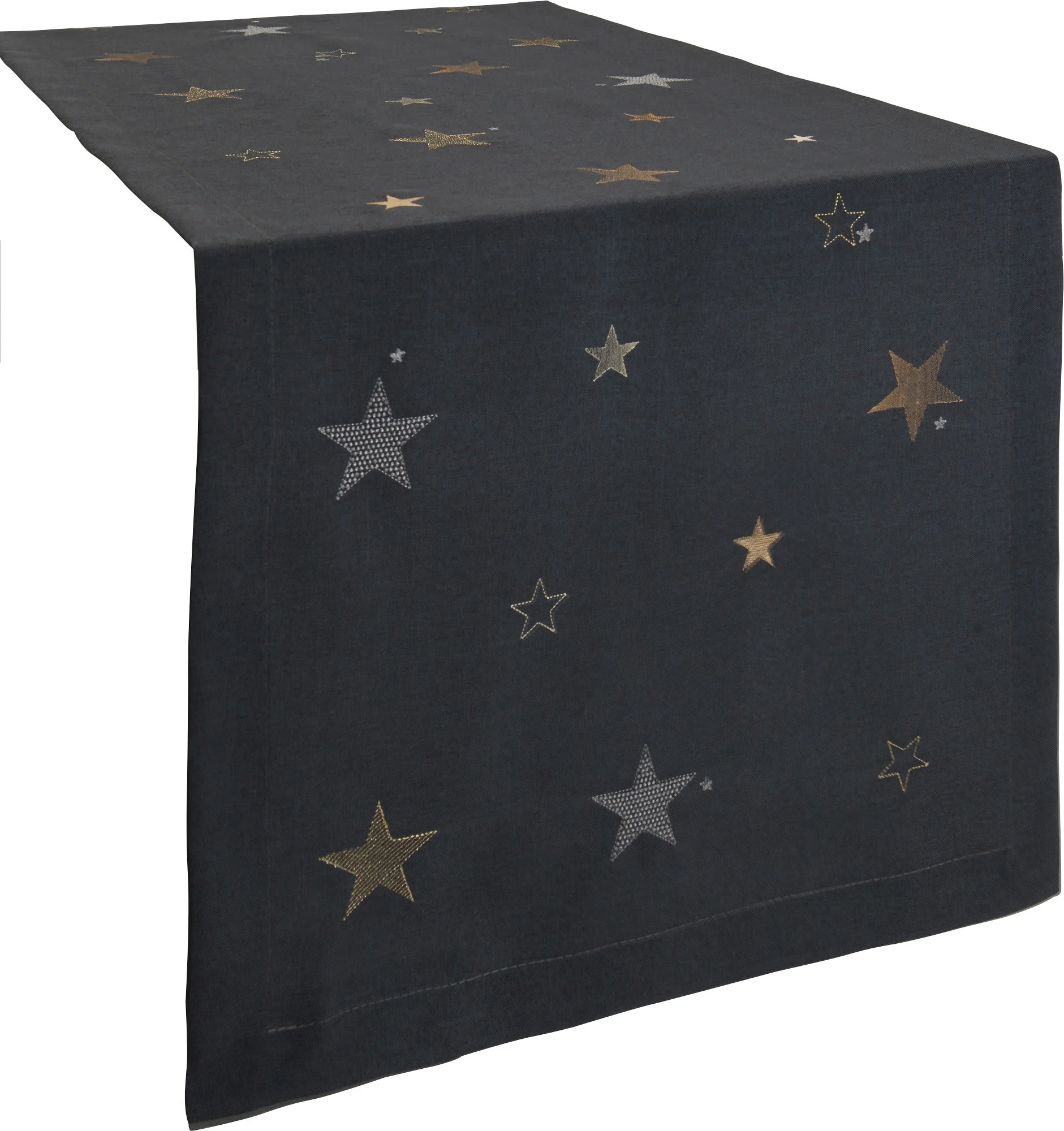 Erwin Müller Tischläufer. Die festliche Serie ist mit unterschiedlichen gold- und silberfarbenen Sternen bestickt. Sie strahlt ein weihnachtliches Wohngefühl und einen Hauch von Glamour aus. Auch nach vielen Wäschen bleibt die pflegeleichte Qualität schön. Sauber verarbeitet mit Kuvertsaum.
