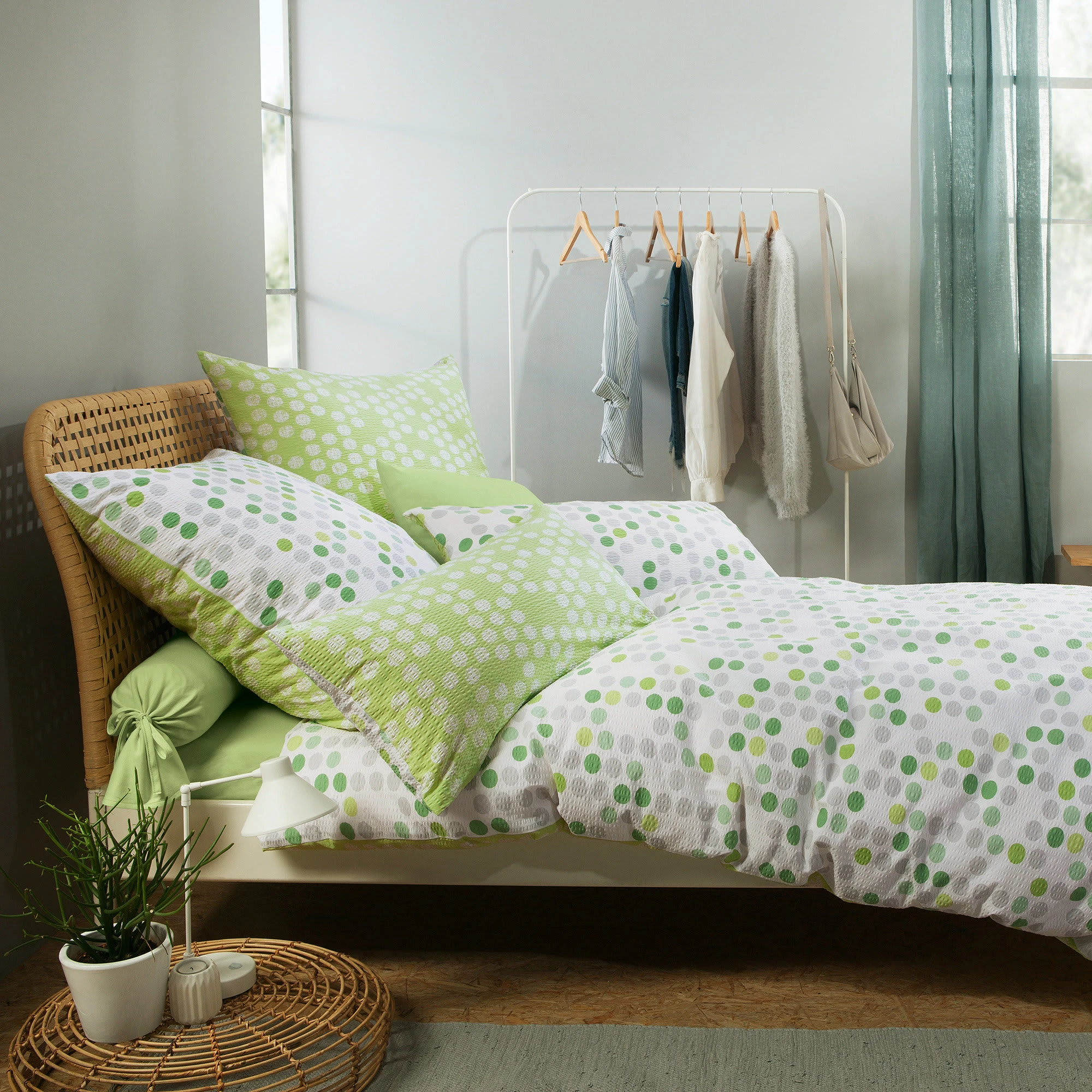Erwin Müller Seersucker Wendebettwäsche. Fröhliche Punkte in zwei harmonisch aufeinander abgestimmten Farbkonzepten überziehen die hübsche Bettwäsche. Die besonders feinfädige Qualität mit der typischen gestreiften Krepp-Struktur ist ein luftig leichter Genuss. Sie ist weich im Griff, hautsympathisch und temperaturausgleichend. Schnell lassen Sie sich von ihren pflegeleichten Eigenschaften begeistern, denn die unkomplizierte Bettwäsche ist praktisch bügelfrei – einfach waschen, trocknen und dank Reißverschluss rasch wieder aufziehen.