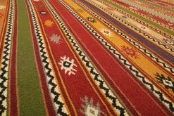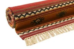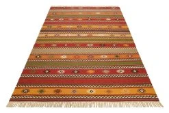 Fernweh? Mit diesem handwebten Teppich beamen Sie sich ratzfatz in eine fremde Kultur. Warme Rot- und Orangetöne und traditionelle Muster bringen einen Hauch Exotik in Ihr Zuhause. Mit einer Florhöhe von 5 mm und einem Gewicht von 1400 g pro Quadratmeter präsentiert sich der Webteppich aus 100% Wolle mit Wollrücken als dekoratives Leichtgewicht. Wir empfehlen eine Anti-Rutsch-Unterlage zu verwenden.