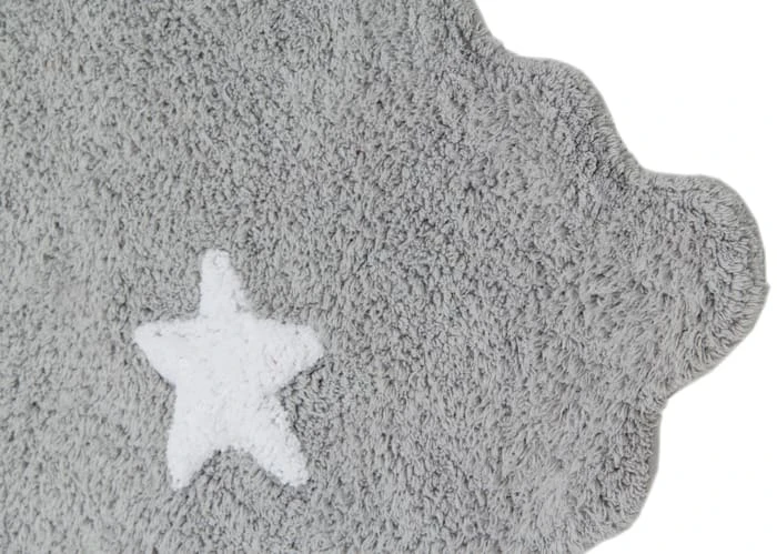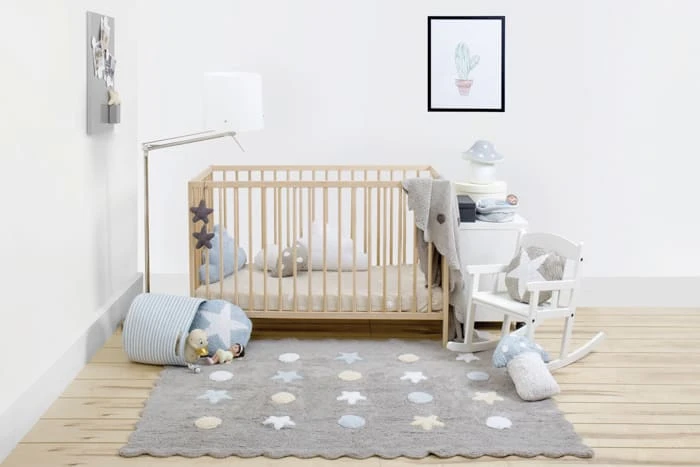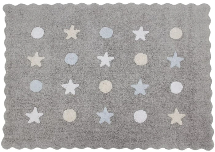 Rechteckiger waschbarer Teppich, mit abgerundeten Umrissen, die kleinen Wellen ähneln, Hintergrund in weicher Pastellfarbe und lustige geprägte Kreise und Sterne, perfekt zum Dekorieren von Baby- und Kinderzimmern…