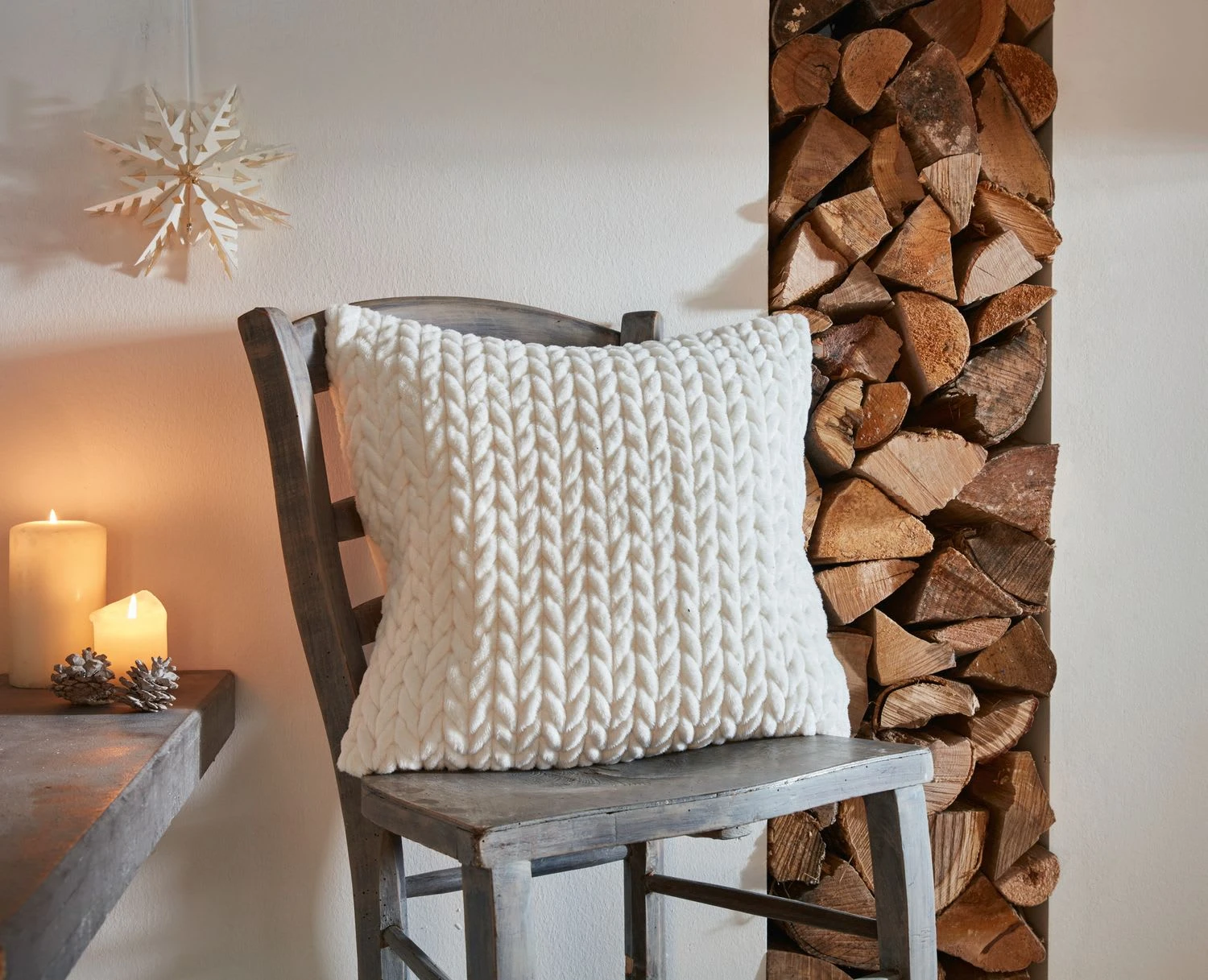 cremefarbener Grundstoff, samtig weich, Rückseite uni, verdeckt eingearbeiteter Reißverschluss, 100% Polyester