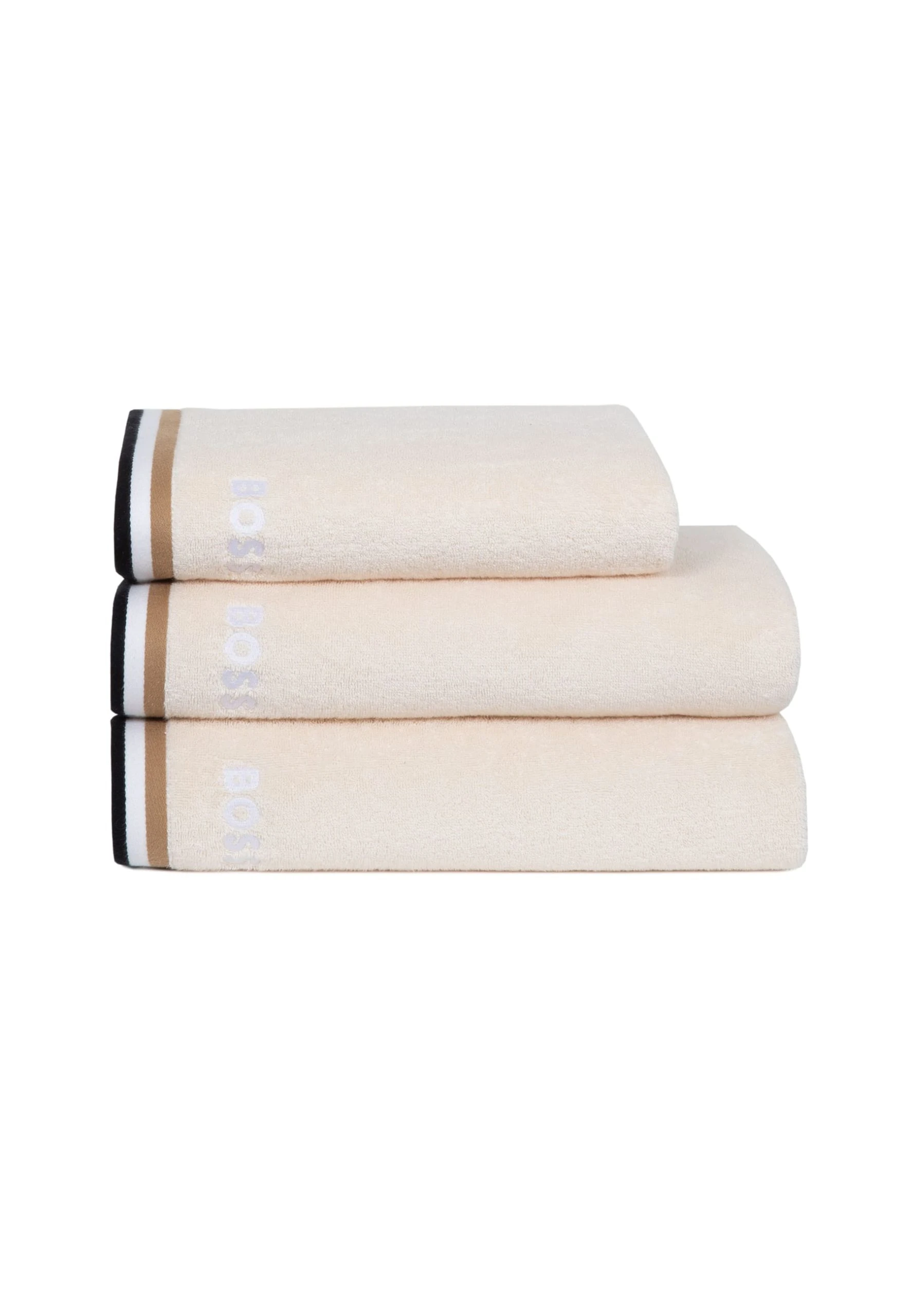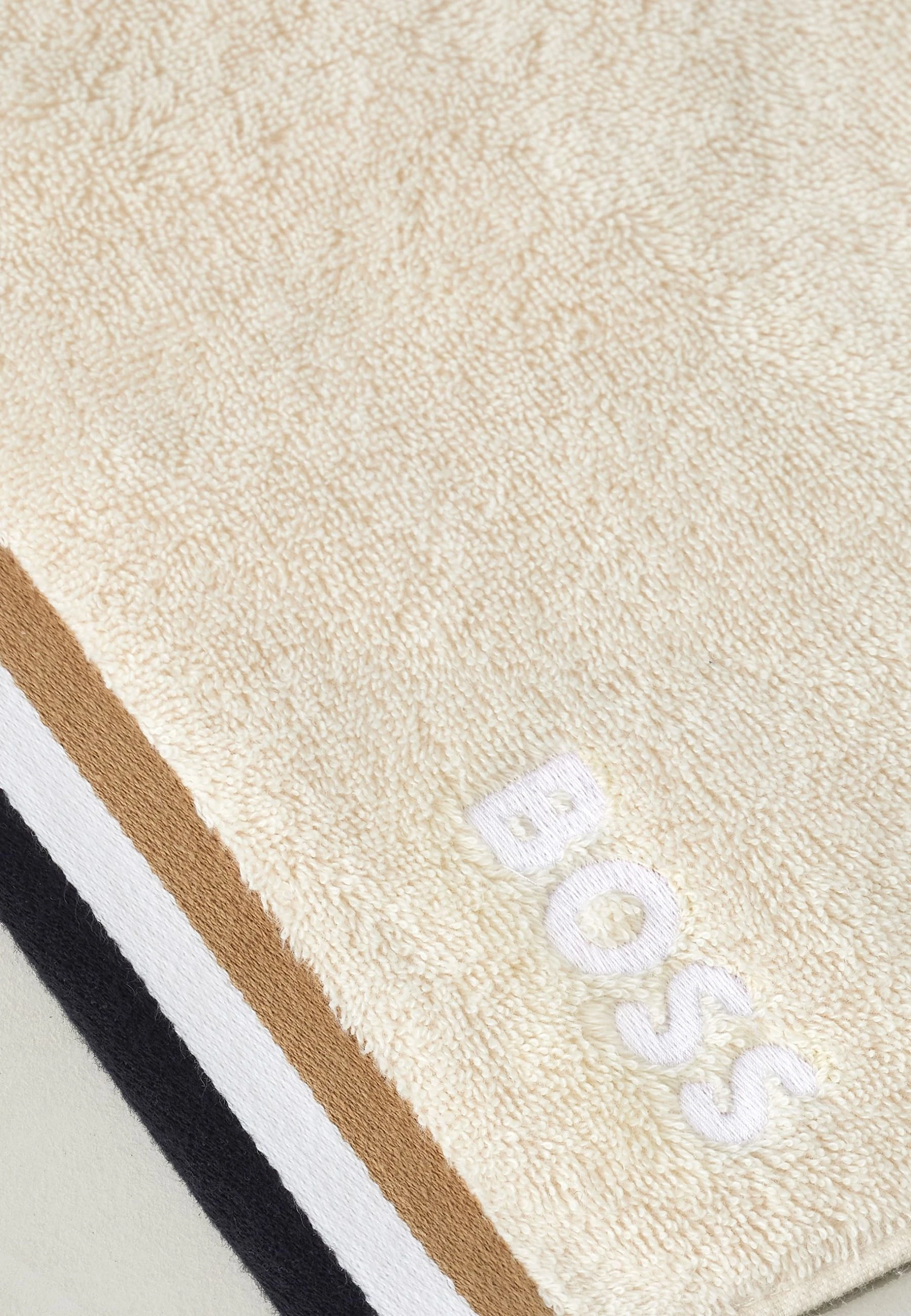 Edle Akzente im Badezimmer setzen Sie mit der zeitlosen Frottierserie Iconic Stripe von BOSS Home mit dreifarbiger Bordüre. Die Jacquardhandtücher sind aus 100% Bio-Baumwolle gefertigt, bleiben dauerhaft weich und präsentieren sich mit einem dezenten und gestickten BOSS-Logo.