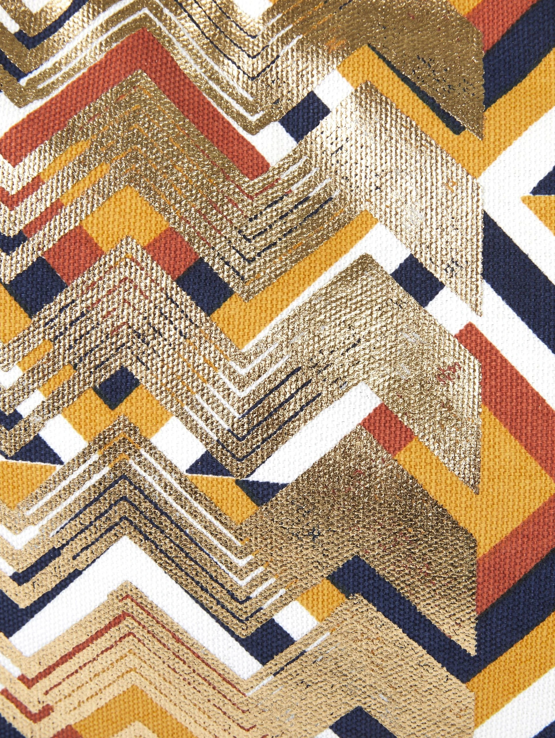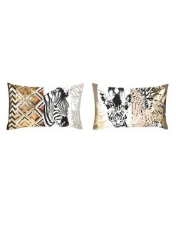 – Die andere Kissenhülle verziert ein Zebra und ein buntes, geometrisches Muster mit goldfarbenen Details