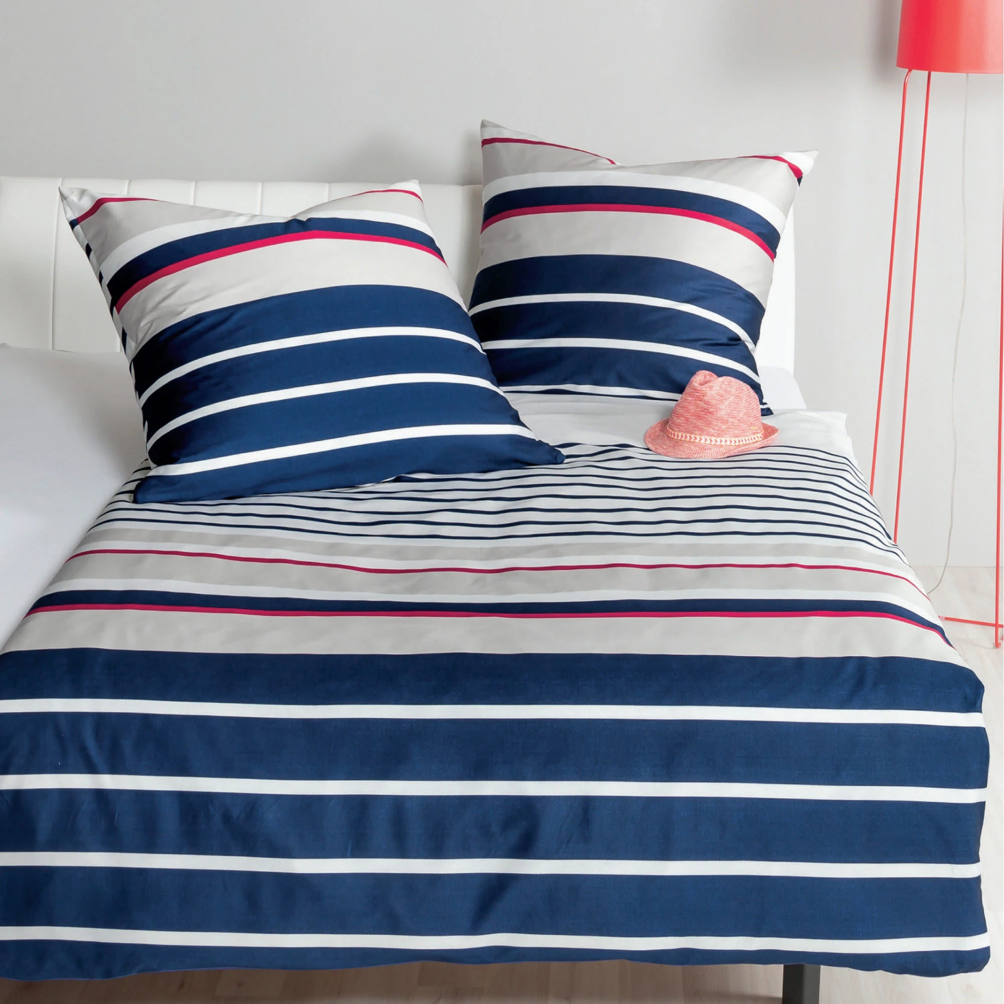 Janine Mako-Satin Bettwäsche. Das moderne Streifen-Dessin in harmonischer Farbgestaltung verleiht Ihrem Schlafambiente einen neuen Look. Mit Kissenbezug zum Wenden. Genießen Sie ein unvergessliches Schlaferlebnis in dem feinfädigen, glatten Gewebe, denn es ist atmungsaktiv, feuchtigkeitsregulierend und hautsympathisch. Mit Seidenfinish – supergekämmte, mercerisierte Garne verleihen dem sinnlichen Stoff seinen charakteristischen Seidenglanz. Pflegeleicht, bügelleicht und einfach zu beziehen dank praktischem Reißverschluss.