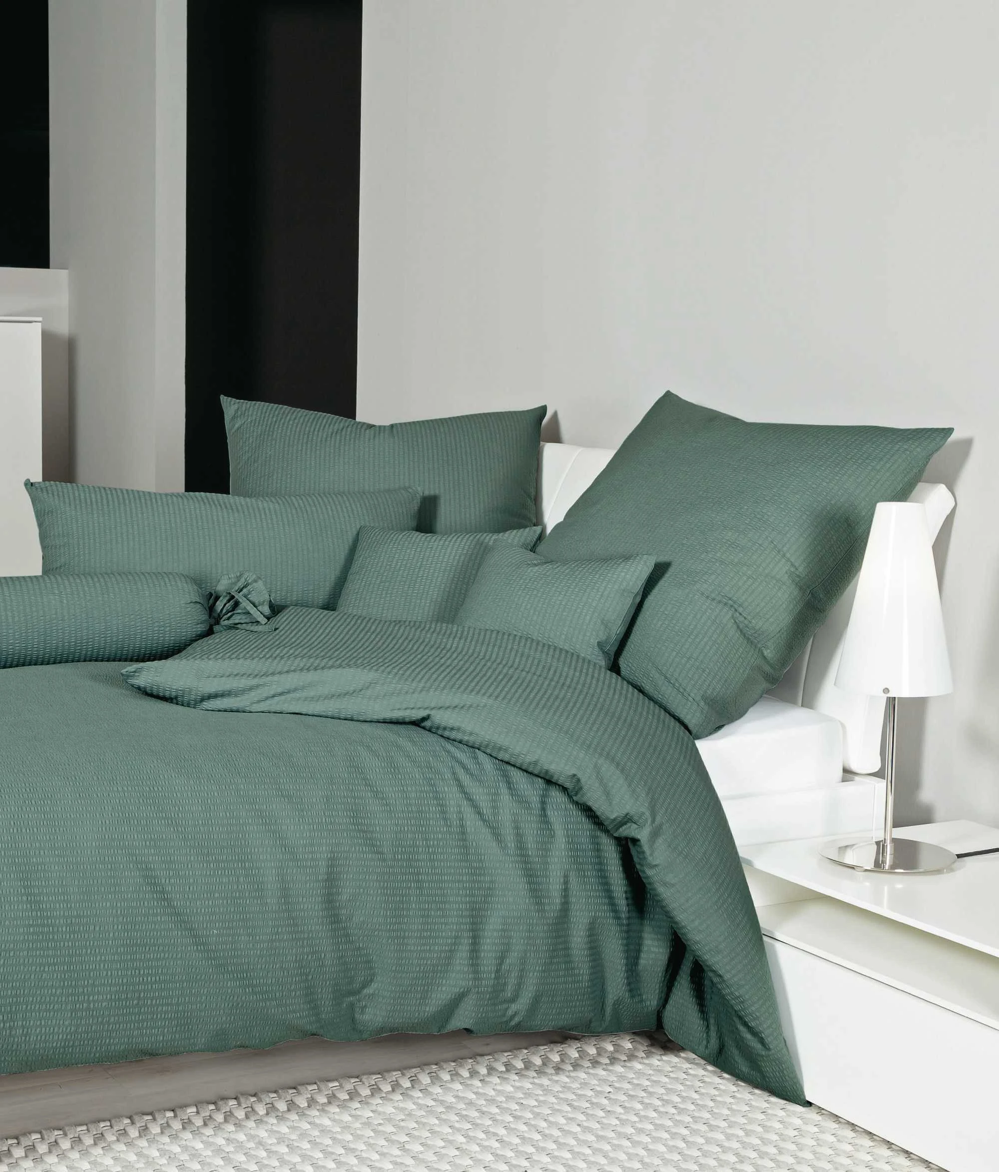 Bettbezug und Kissenbezug mit Seersucker-Struktur, bügelfei – für einen gesunden Schlaf und leichte, bequeme Pflege. Erstklassige Konfektion mit Marken-Reißverschluss.