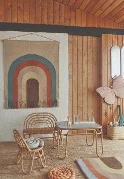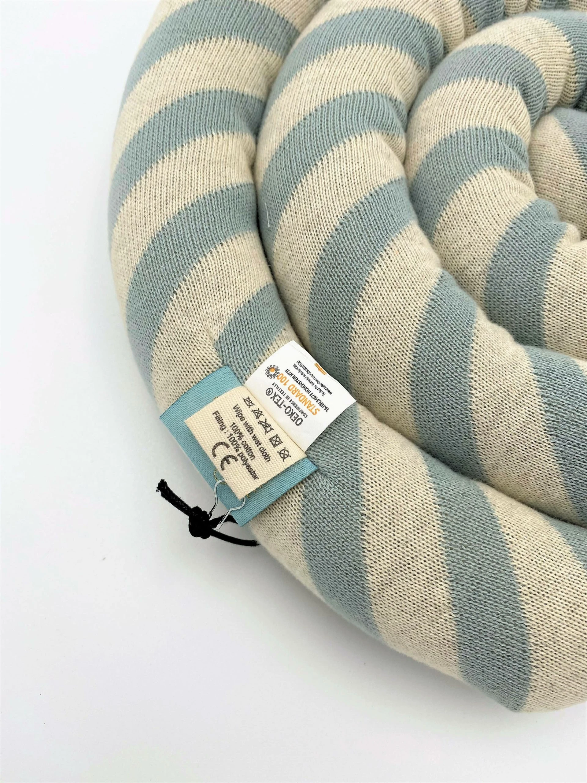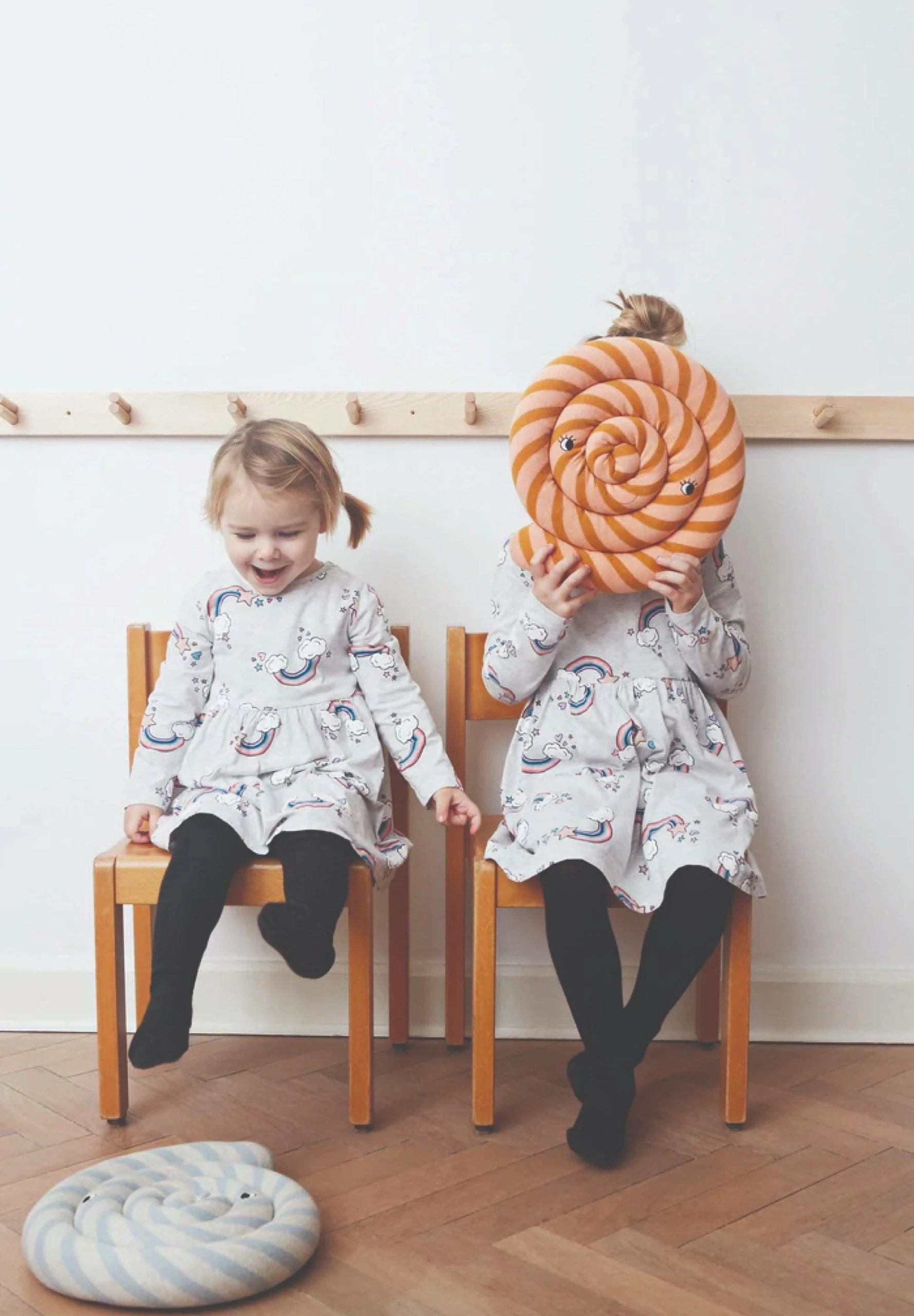 Mit seinem bunten Streifenmuster und seiner lustigen und kreativen Form wirkt das Lollipop-Kissen sehr niedlich und verspielt.Das Kissen ist in zwei Farben erhältlich: Blau und Karamell.Das Kissen besteht aus Baumwolle, ist gestrickt und hat eine weiche Faserfüllung.Zur Reinigung wird empfohlen, es mit einem feuchten Tuch abzuwischen – nur punktuell reinigen.