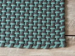 Farblich ist der Pad Teppich in einem angenehmen und sehr edlen türkis-Grau gehalten, das sich sehr gut in jeden Wohnstil integrieren lässt. Weiter wird die Optik der Matte durch das dicke verwobene Fasergarn charakterisiert.