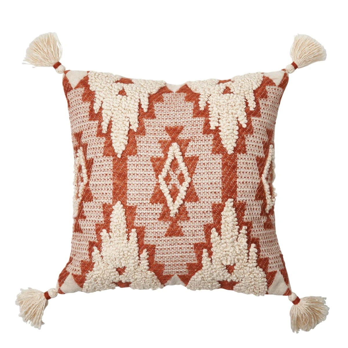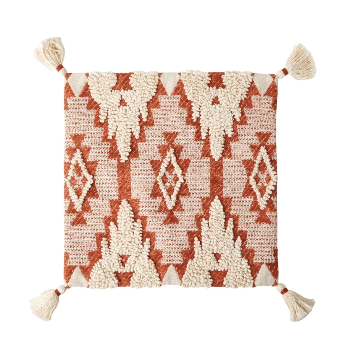 Die dekorative Kissenhülle ist mit aufwendigen Applikationen aus Baumwollfäden veredelt, die dem Stoff eine tolle Struktur verleihen. Vier Quasten vervollständigen den Ethno-Look.