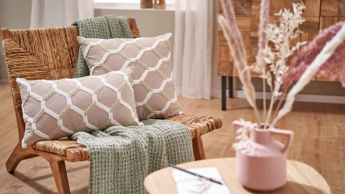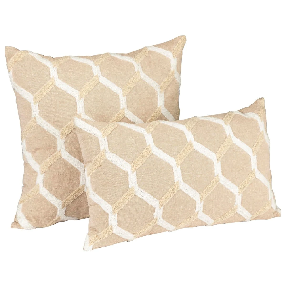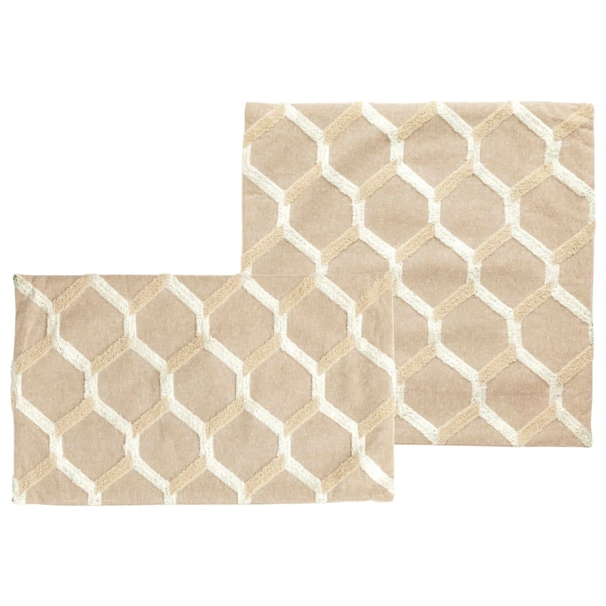Wunderschönes Kissenhülle-Set mit grafischem Design. Kissenbezug aus Baumwolle, die flauschigen, grafischen Muster sind aus Acrylgarn gefertigt.