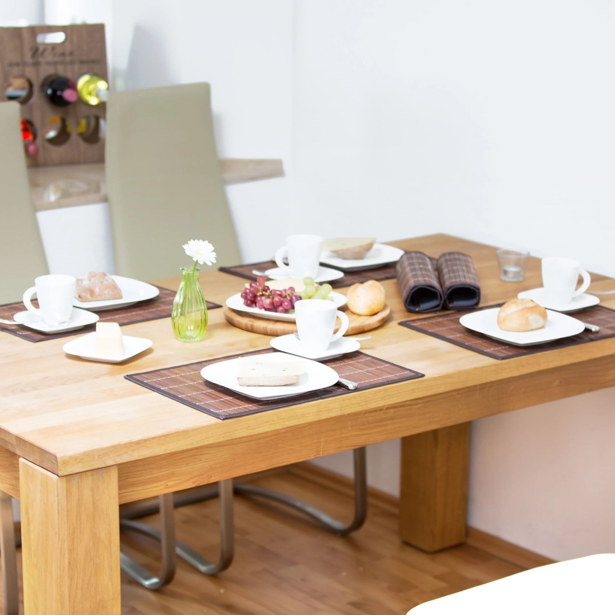 Diese Platzdeckchen schützen Ihren Tisch vor Kratzern, Verbrennungen und lästigen Spritzern. Das 6 teilige Platzset von ca. 30 x 45 cm ist aus feuchtigkeitsresistentem Bambus gefertigt und somit besonders robust. Es hält auch kleinere Mengen Flüssigkeit für kurze Zeit sicher von empfindlichen Oberflächen fern. Durch die rutschhemmende Unterseite liegen die Tischmatten sicher auf dem Tisch. Nach dem Gebrauch können Sie Krümel einfach abklopfen und Verschmutzungen mit einem feuchten Lappen entfernen.