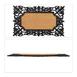 Mit dieser dekorativen Eingangsmatte vor der Haustür hältst Du Deine Innenräume zuverlässig sauber. Die wetterfeste Schuhmatte aus Gummi und Kokos kann dazu drinnen oder draußen platziert werden. Dank der rutschfesten Unterseite haftet die Schmutzmatte beim Abtreten der Schuhe fest am Boden. Über seine praktischen Eigenschaften hinaus überzeugt der Fußabtreter ebenso mit ansprechendem Design. Der Mix aus schwarzen Ornamenten und Naturfasern ist ein echter Blickfang für jeden Eingangsbereich.
