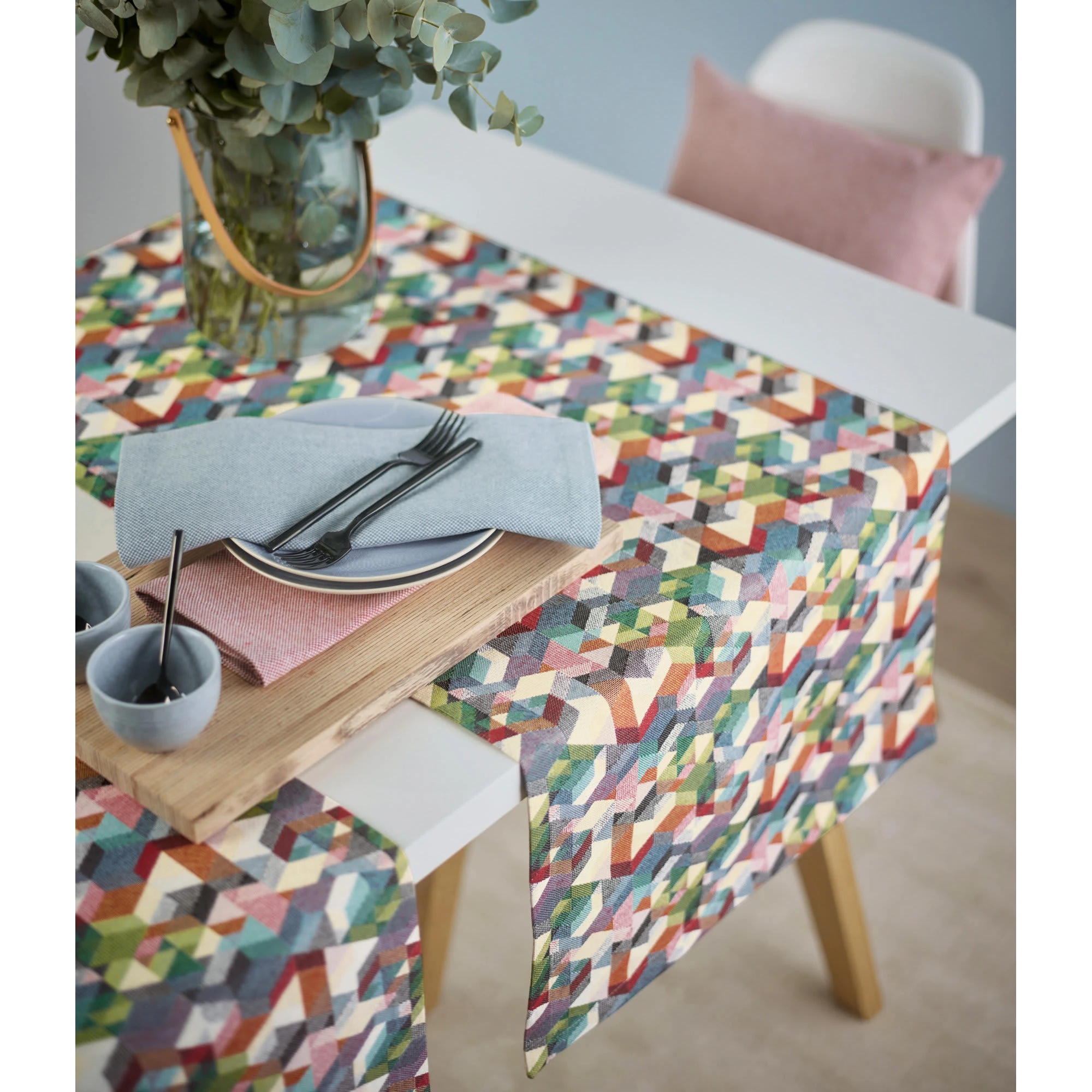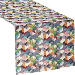 Sander Tischläufer “Cubes”. Fröhlich bunt und modern zeigt sich das ausgefallene grafische Würfel-Muster. Es verbreitet eine angenehme und zugleich frische Atmosphäre rund um Ihren Tisch. Durch die hochwertige Jacquard-Webung kommt das ausgefallene Dessin besonders schön zur Geltung. An dieser Qualität haben Sie lange Zeit Ihre Freude. Das schwere, strapazierfähige Material kombiniert die natürliche Optik der Baumwolle mit den pflegeleichten Eigenschaften des Polyesters. Sorgfältig mit Kuvertsaum gearbeitet.