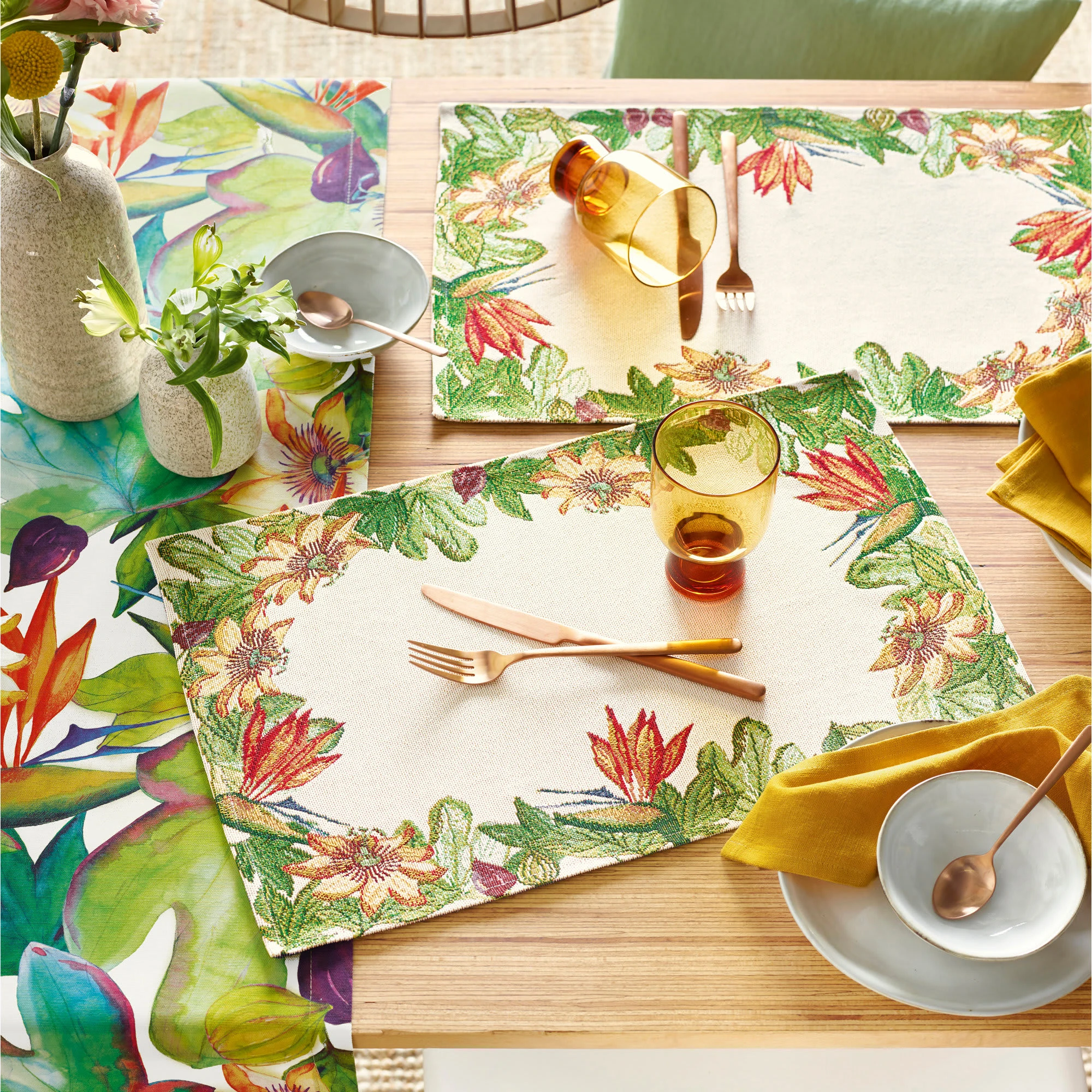 Sander Gobelin Tischset “Annalena” im 2er-Pack. Strelizien und Passionsblumen bringen eine exotische Blütenpracht auf Ihren Tisch. Das Motiv wurde bildhaft und kraftvoll in den ganz besonderen Stoff gewebt. Dieser ist in traditioneller Webkunst gefertigt, edel und robust zugleich. So fasziniert er den Betrachter und überzeugt durch seinen rustikalen Charme. Ausdrucksstark, strapazierfähig und langlebig.