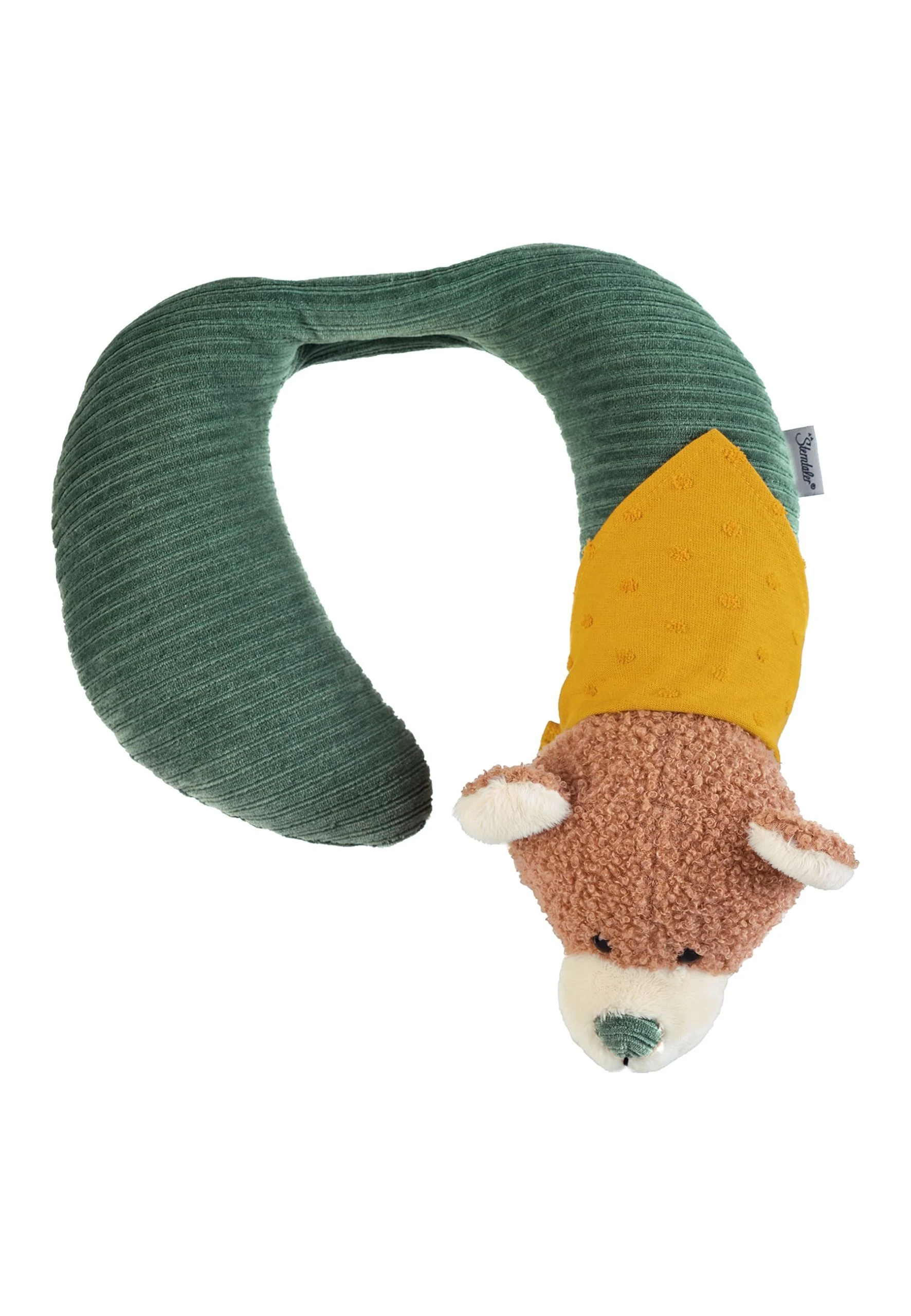 Große Nackenstütze Bär Ben aus Plüsch, Nicki und Jersey. Die ergonomisch geformte Nackenstütze bietet wohltuende Entlastung für die Halswirbelsäule und den Schulterbereich. Mit eingesetzter Rassel.