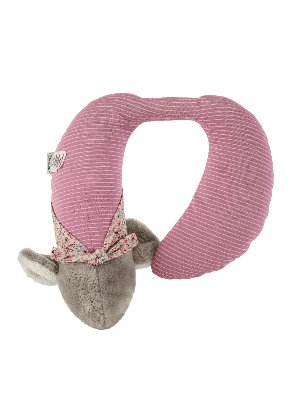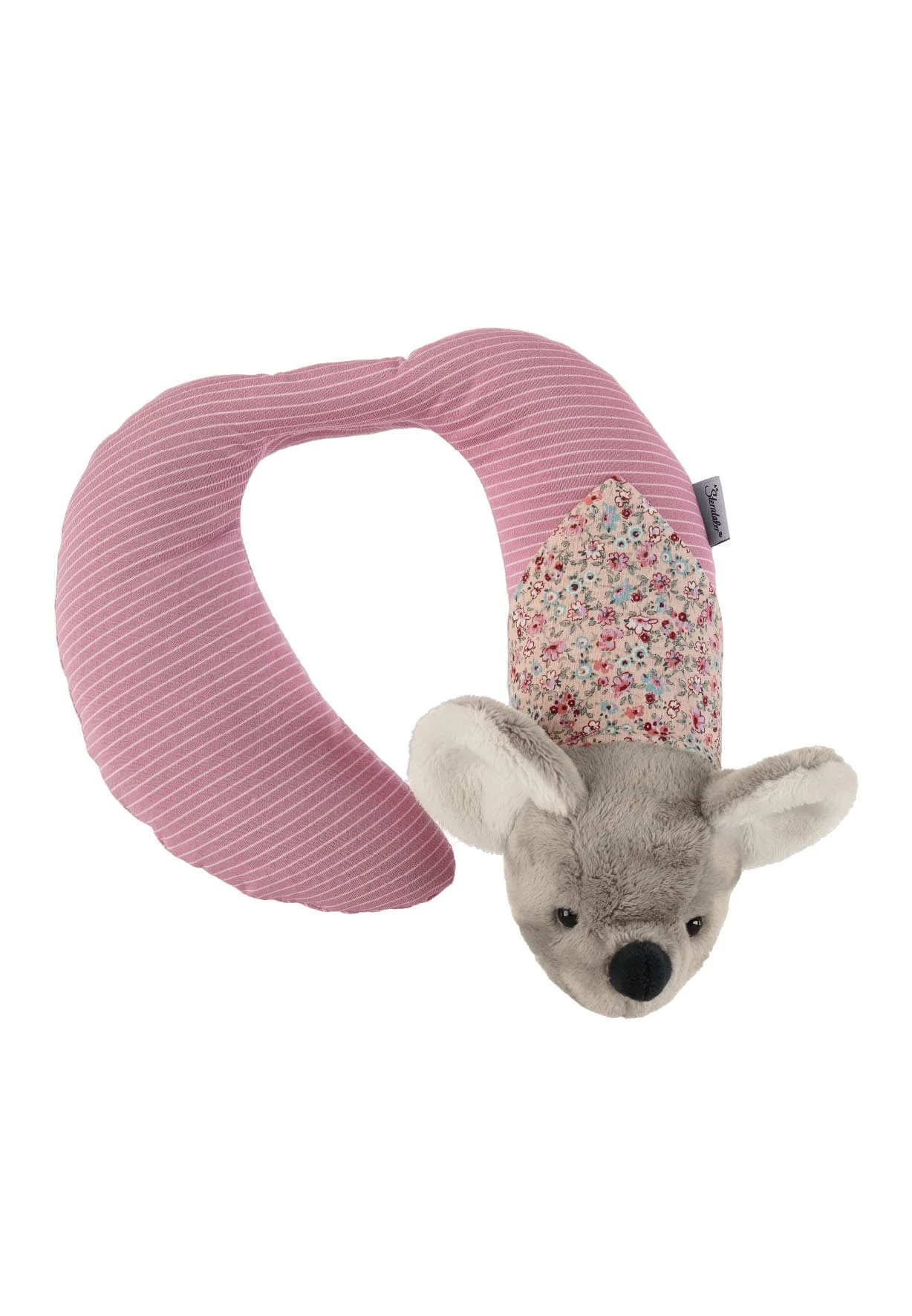 Große Nackenstütze Maus Mabel aus Flauschstoff und Jersey. Die ergonomisch geformte Nackenstütze bietet wohltuende Entlastung für die Halswirbelsäule und den Schulterbereich. Mit eingesetzter Rassel.