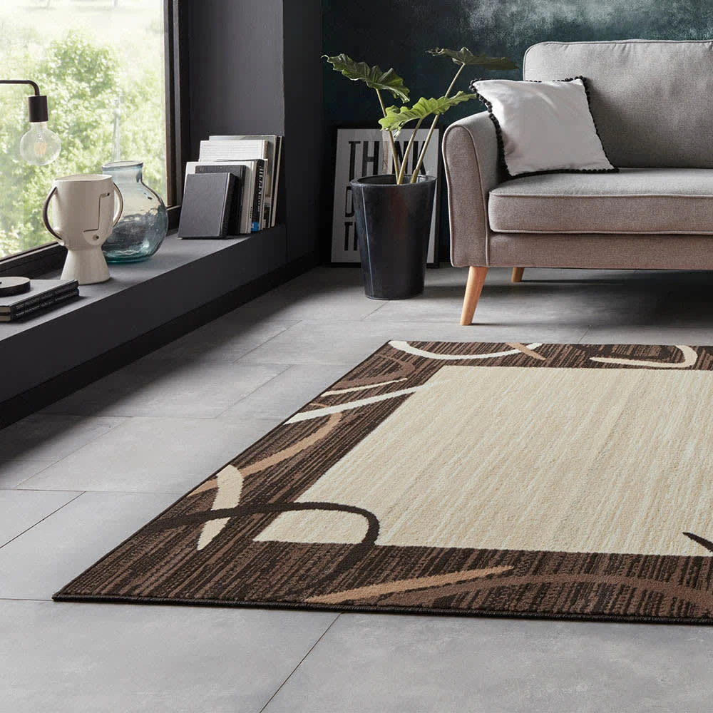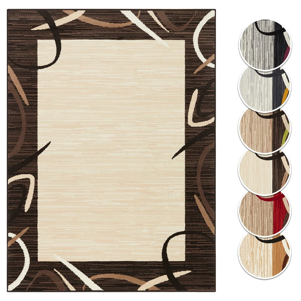 Dieser moderne Design Teppich mit eleganter Bordüre Umrandung wird Ihrem Wohnbereich eine frische Atmosphäre verleihen. Die klassische Bordüre wird dabei von schwungvollen Linien auf melierten Hintergrund unterbrochen. Dies macht den Kurzflorteppich durch diesen raffinierten Look zu einem echten Hingucker in Ihren Räumlichkeiten. Perfekt aufeinander abgestimmte Farbvariationen runden die außergewöhnliche Gesamterscheinung ab. Die Kunstfaser Polypropylen sorgt für eine lange Lebensdauer und gute Wärmedurchlässigkeit im Einsatz mit Fußbodenheizungen. Wir empfehlen eine Anti-Rutsch-Unterlage, um auf glatten Böden ein mögliches Verrutschen zu vermeiden.