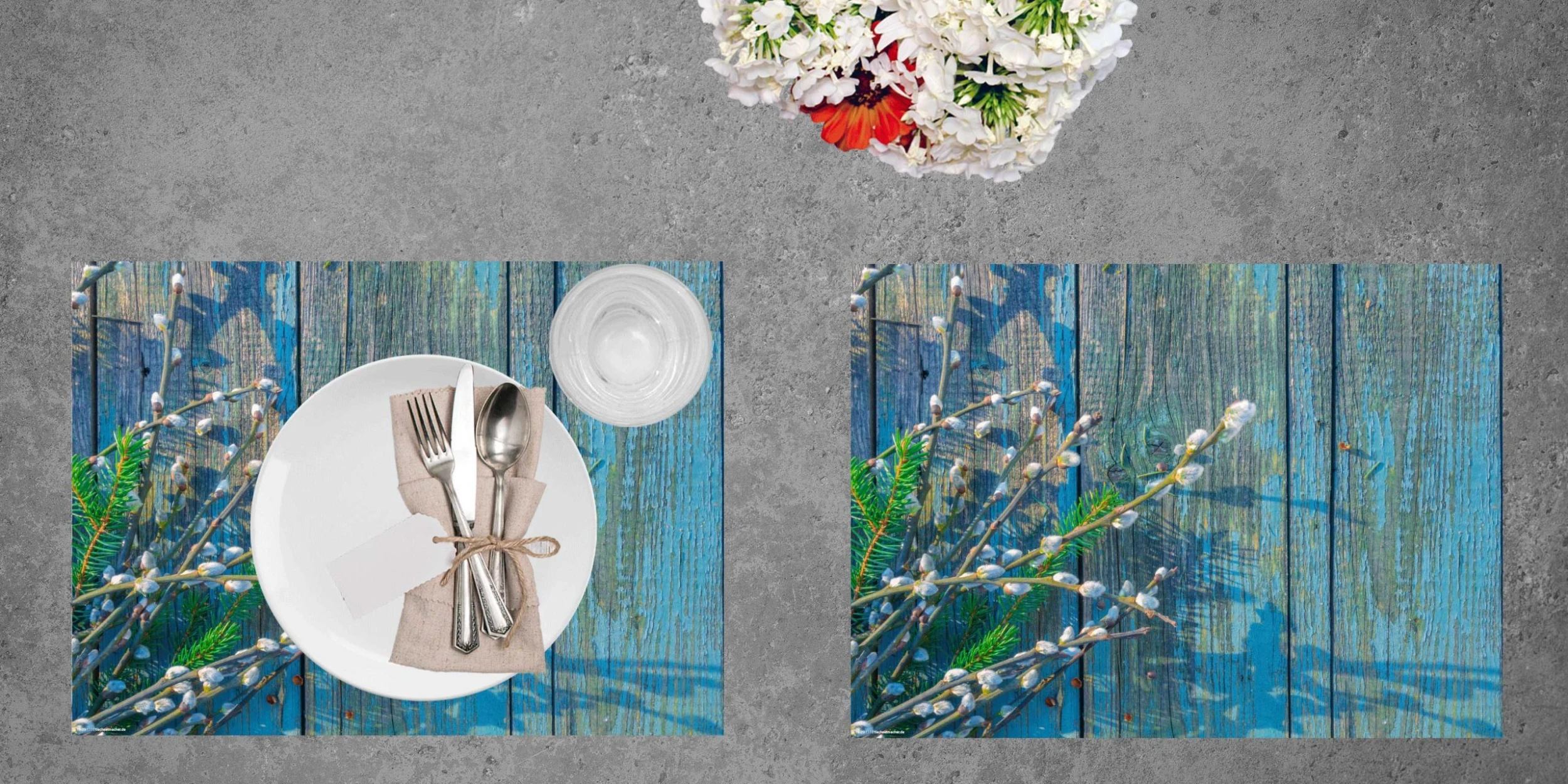 Tolle Tischsets mit Weidenkätzchen auf blauem Holzhintergrund. Macht Lust auf die schönste Zeit des Jahres, verwandelt Ihren Tisch in einen echten Hingucker und gibt ihm eine individuelle Note! Die Platzsets der Tischsetmacher sind die ideale Kombination aus Schutz vor Flecken und einzigartiger Tischdekoration mit Stil! Umweltfreundlich, recyclingfähig und mehrfach verwendbar. Verpackungseinheit 12 Stück (Größere Auflagen auf Anfrage).