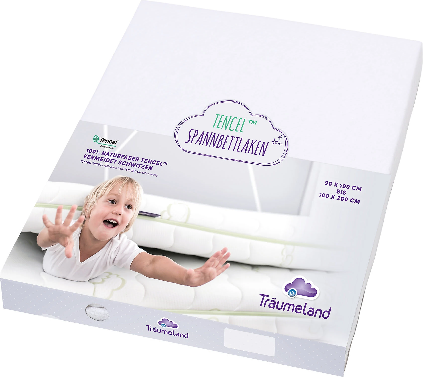 Das Träumeland Spannbettuch aus TENCEL™ zeigt sich in faltenfreiem Sitz durch abgenähte Ecken und Rundumgummi. Es ist schnell und einfach überzuziehen und besitzt eine hervorragende Spannkraft und gute Dehnbarkeit.