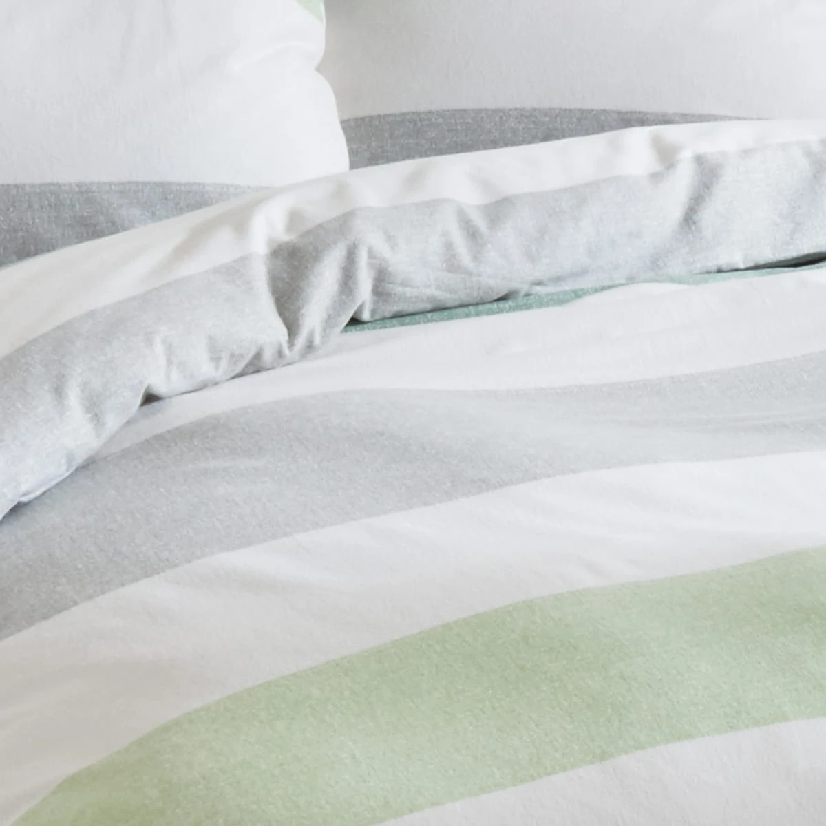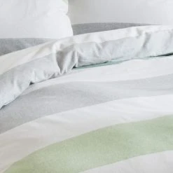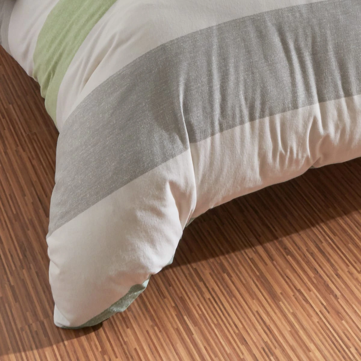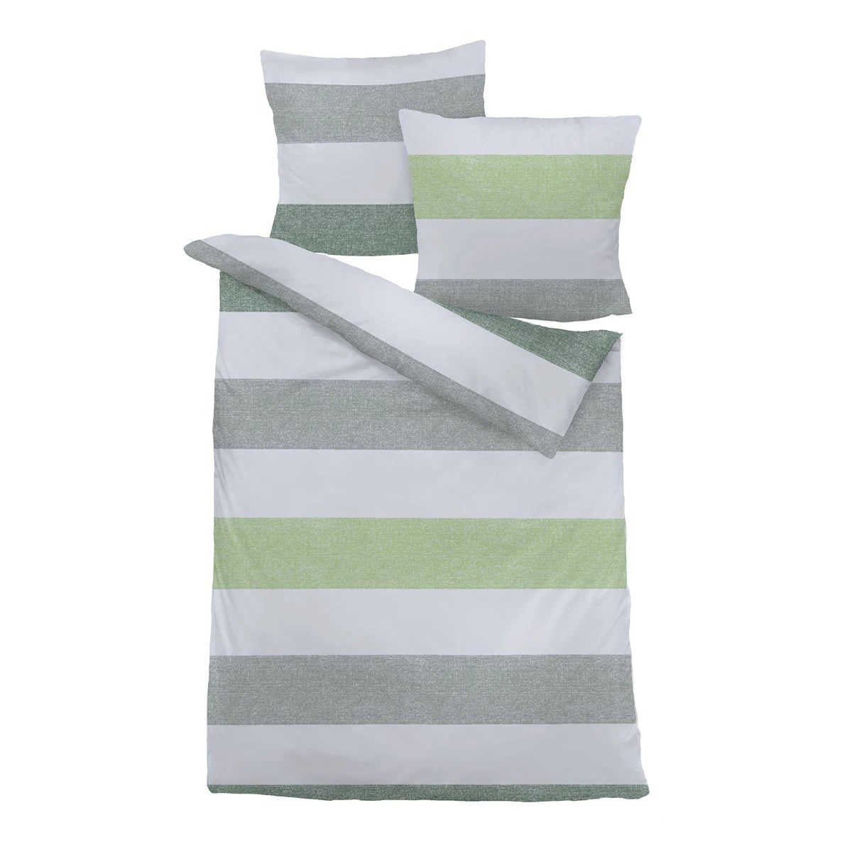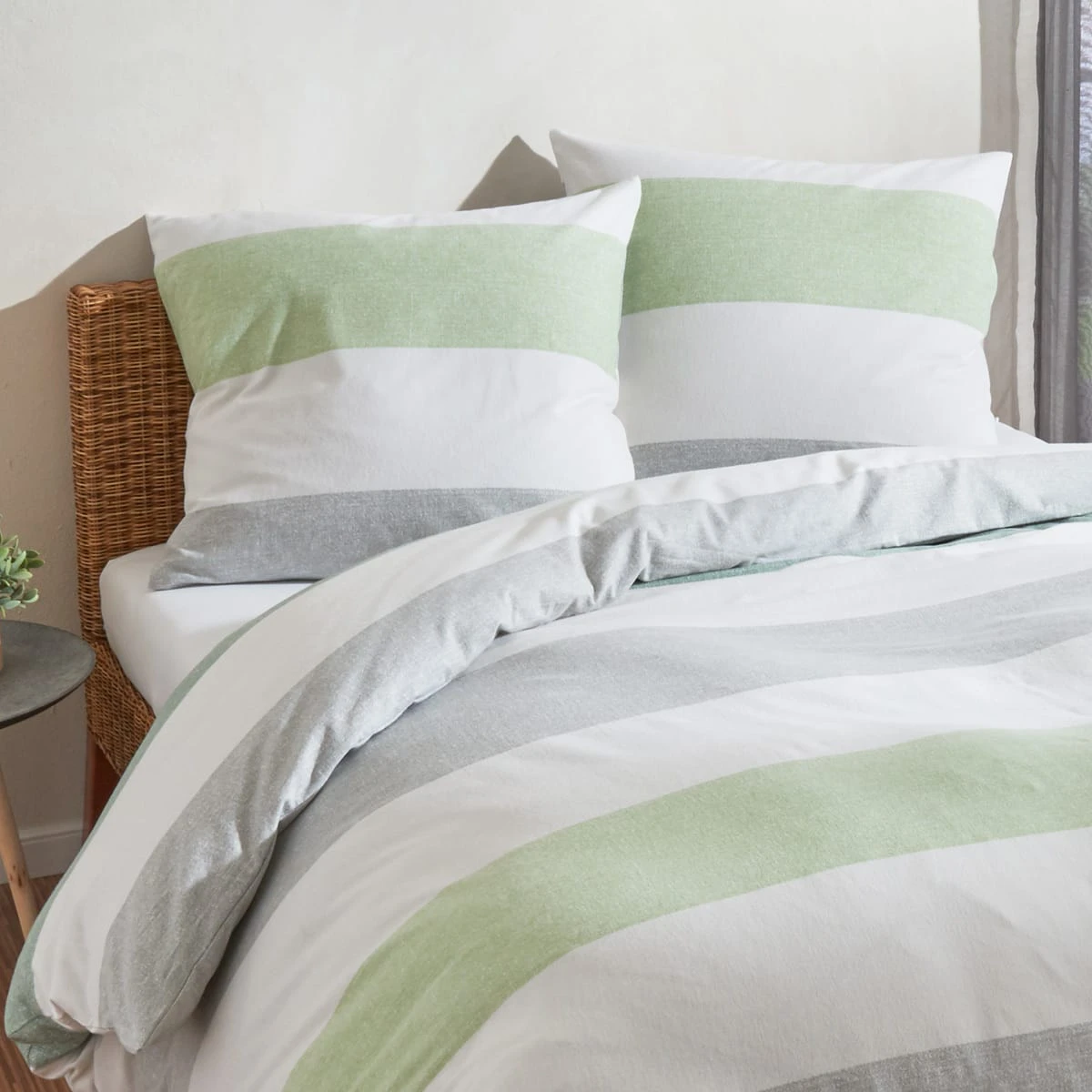 Diese Winterbettwäsche überzeugt mit einem Blockstreifenmuster in den Farben Weiss, Wollweiss, Grau und Grün.