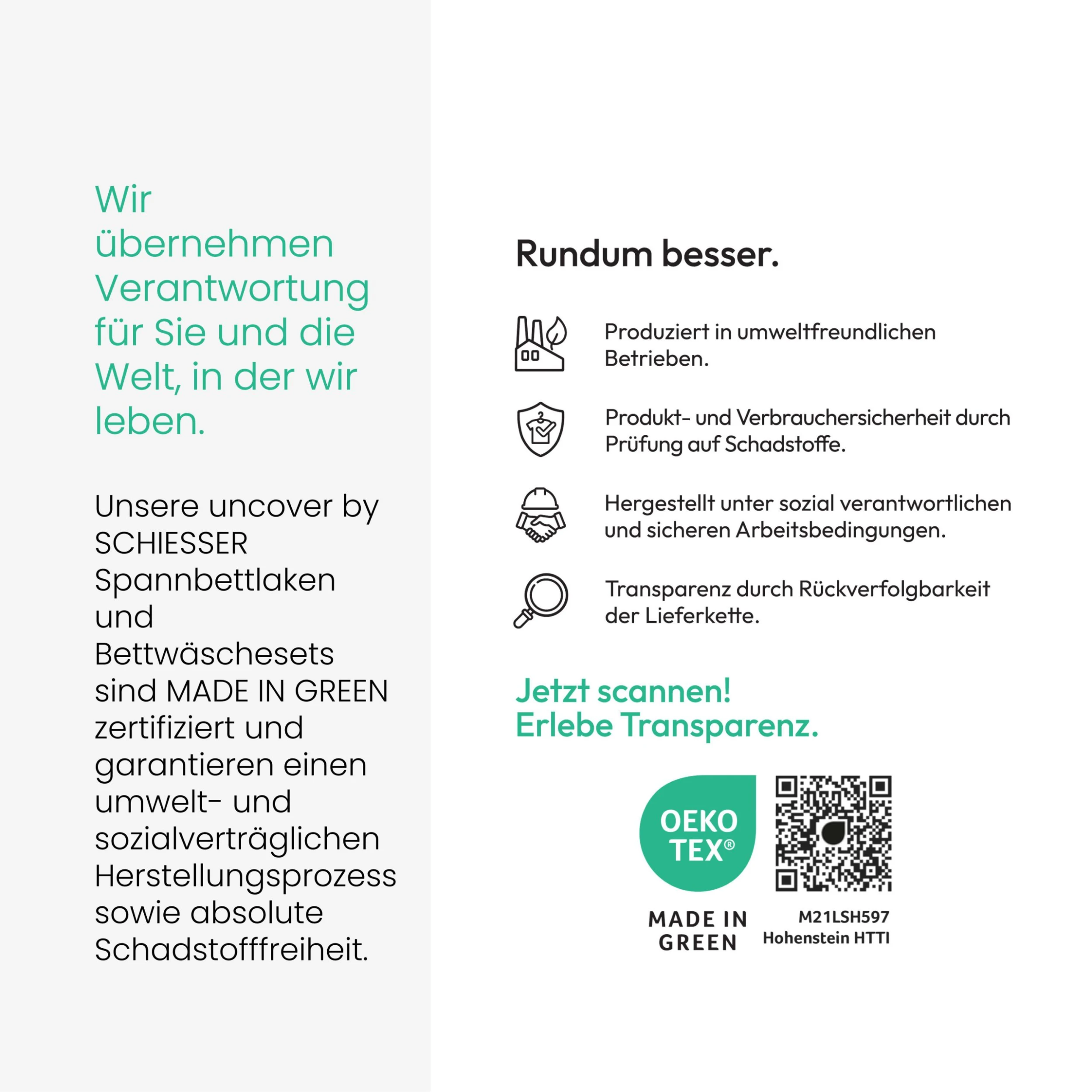 Das Bettlaken passt auf alle gängigen Matratzen mit einer Höhe von bis zu 20 cm und ist in drei Größen und mehreren Farben erhältlich. Ein hochwertiges Rundumgummi sorgt für perfekten Halt – Verrutschen ausgeschlossen! Es ist Teil der uncover by Schiesser Home Kollektion. Viel Spaß beim Stöbern.