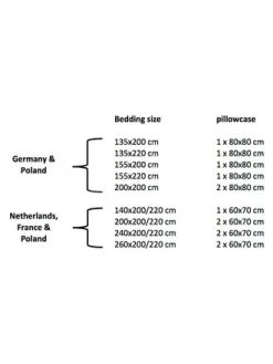 – Verschluss/ Fixierung bei niederländischen Größen (140 x 220 cm, 200 x 220 cm, 240 x 220 cm und 260 x 220 cm): Hotelverschluss/ 20 cm Verlängerung, die am Bettende unter die Matratze geschoben wird, um ein Verrutschen zu vermeiden